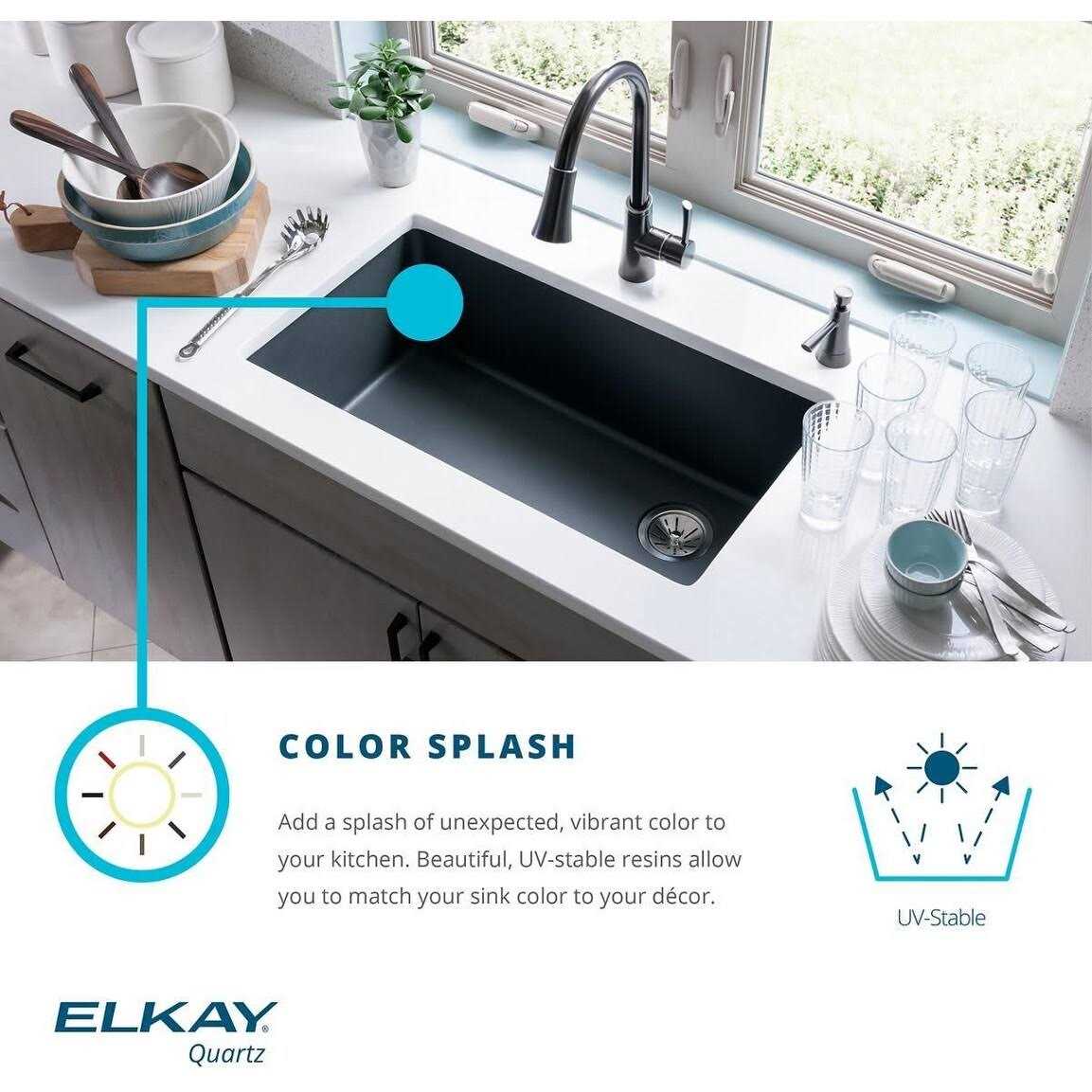Elkay quartz classic sinks have a smooth surface and a visible depth to their structure. They’re crafted from natural quartz and come in a range of UV-stable neutral colors in shades of black brown gray and white that allow you to add an unexpected pop of color to your space. Whether it’s a kitchen sink or a prep bar or laundry sink this composite sink has the durability you need to take on tough tasks. Available in ADA depths. Coordinate your sink color with your decor and style. Drain placement provides more usable space on the bottom of the sink and in the cabinet below. Material is naturally sound-deadening minimizing sound and vibration for a quieter time at the sink. Material is ultrafine nonporous structure means food and liquid won’t stick to surface. Minimum cabinet size for this sink is 21″. Molded from fine quartz sand to resist banging chipping and scratches. Prevents the spreading of bacteria. Sink drain opening measures 3-1/2″. Versatile design allows the sink to be installed as a drop-in or undermount. Washes clean with soapy water.