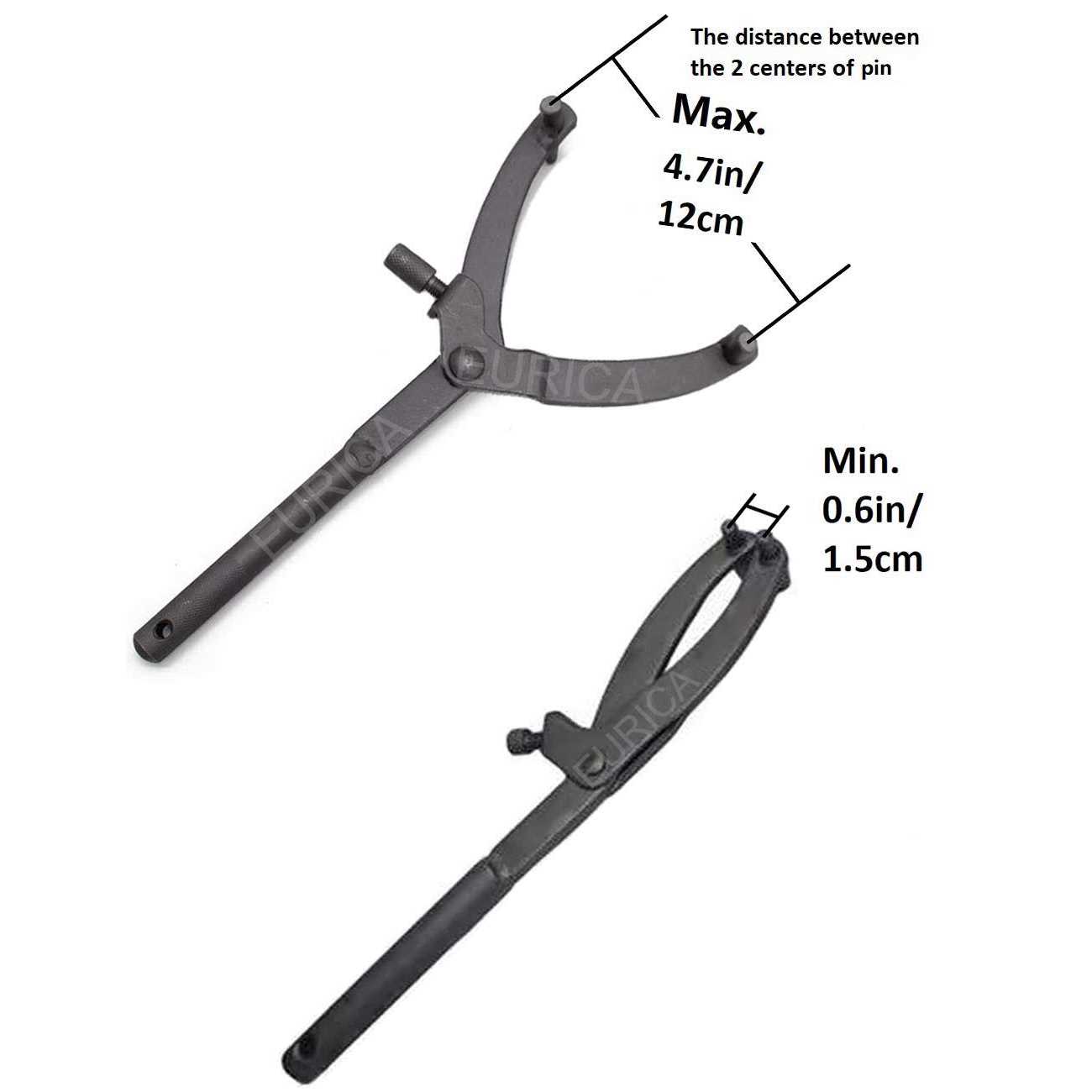 Wide Applications: Adjustable Screw And Two Sizes Of Pin On Either Side Make This Spanner Wrench Suitable For Different Distances Between Slots And Different Sizes Of Slots. Package Includes: 1 Spanner Wrench With 2 Detachable Pins Which Have Been Already Built-in. Dimension: Length: 11.8in (30cm). Arms Opening Width: 0.6in-4.7in (1.5cm-12cm). Material & Manufacturing: Our Spanner Wrench Is Made Of High Quality Iron, Which Is Not Easy To Bend. With Good Manufacturing, Fine Workmanship And In Reliable Quality, It Is Durable And Strong.