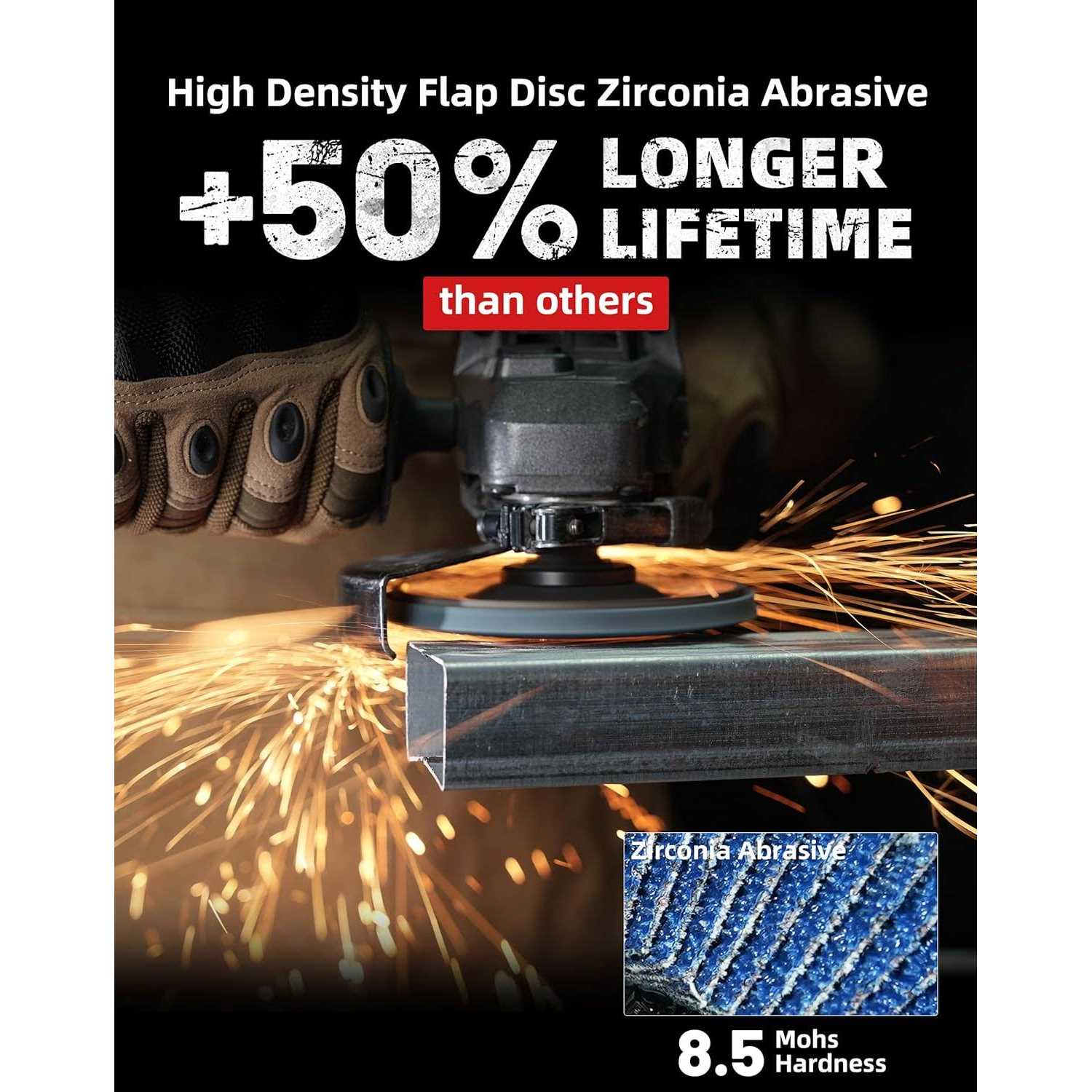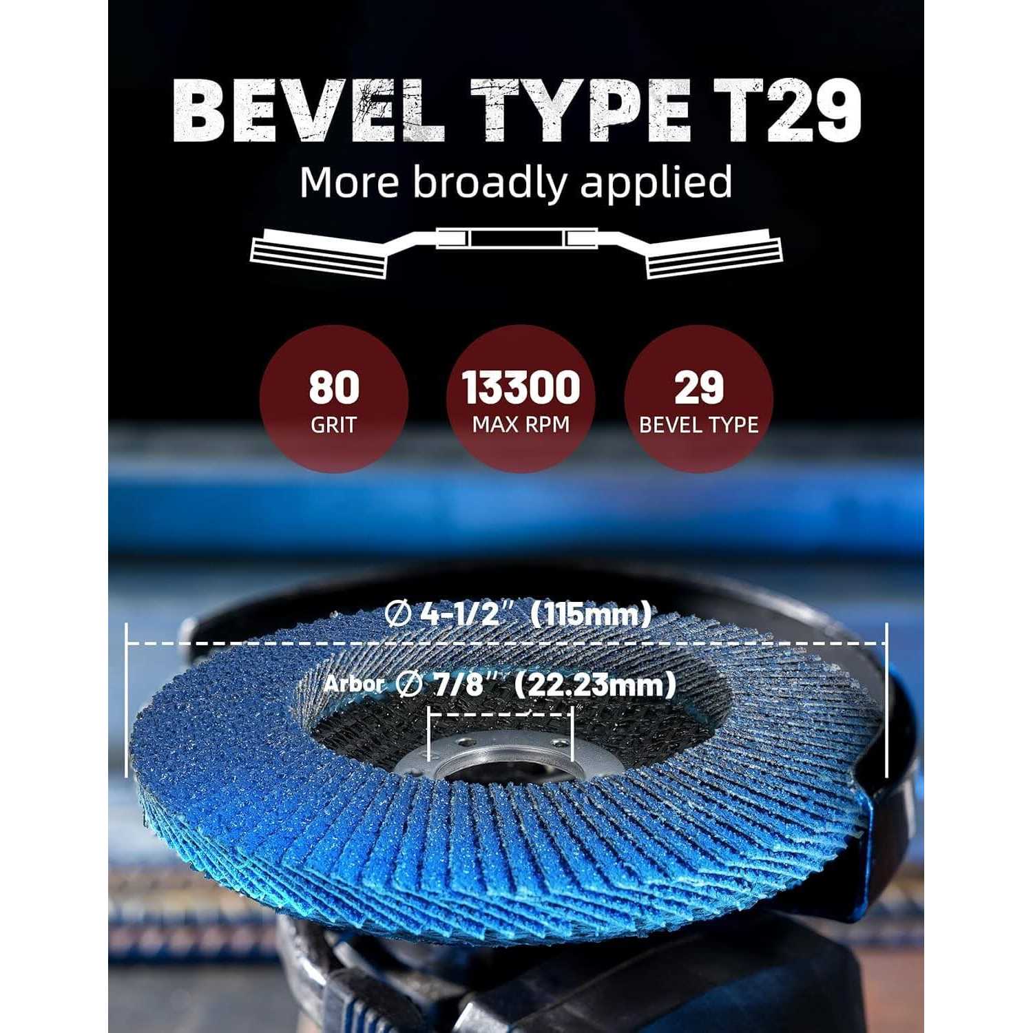Detail: 【Upgraded High-Density】Each flap disc is equipped with 90 abrasive flaps, a 25% increase over the standard 72 flaps found in common market variants. This results in superior grinding efficiency, enhanced durability, and increased density. 【Zirconia Oxide Grains】EZARC Flap disc is crafted from premium blue zirconia oxide grains, ensuring strength and durability, extending its lifetime by 50%. 【Multi Application】80 grit flap disc is coarser in build and is ideal for heavier stock removal. Our flap disc is widely used for metal or wood, to remove the weld reinforcement, deburring, polishing, and to rust removal. 【Convenient to Use 】Bevel Type 29 angle design makes the edge and corner grinding much more convenient, great for surface sanding, and working on welded seams at a working angle of 5 to 15°. 【 Professional Grinder Flap Disc 】 4-1/2-inch diameter with a 7/8-inch arbor size compatible with an angle grinder with a maximum 13,300 RPM grinding speed. This angle grinder flap disc is designed for grinding, blending, sanding, and finishing on a wide range of material. High Material Removal Rate Long Lifetime Application