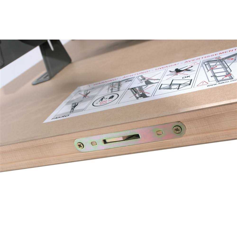 The FAKRO LMS attic ladder is a folding metal attic ladder where both hath and box are made of pine wood. The ladder itself is made of powder-coated metal RAL 7022. The beige hatch 1 3/8in thick is paintable to match the interior design. The unit is sealed with a peripheral gasket that lines the frame. The ladder’s segment folding system and possibility to lock the door in fully open position ensure an ease of operating. The double hinges’ joints and stringer’s profile plugging guarantee high ladder’s durability. The hatch hinge’s corner prevents frame deformation. The visible side of the door is smooth.