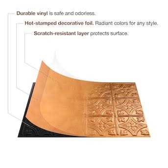 Fasade Lay-in decorative thermoplastic ceiling tiles provides the classic look of traditional tin ceilings for a fraction of the cost. The ceiling panels feature quick and easy installation, inserting easily into any existing or new suspended ceiling grid. Whether you’re remodeling an entire room or simply accenting a small area, these ceiling panels create an instant designer look. Unlike traditional tin panels that require decades to acquire an antique look, these ceiling tiles have that turn of the century authenticity right out of the box. Sturdy PVC construction that offers the classic look of a traditional tin ceiling Great for remodeling or new construction Water and corrosion resistant for exceptional durability Panels can lay-in to an existing ceiling grid Can be cut with a snip, scissors or utility knife for quick and easy installation Matching grid covers and ceiling grid systems are available Pack includes five 2 ft. x 2 ft. ceiling tiles Create a classic and distinctive look to any space in your home with the addition of this Fasade Dunes Vinyl Lay-In Ceiling Tile in Cracked Copper.