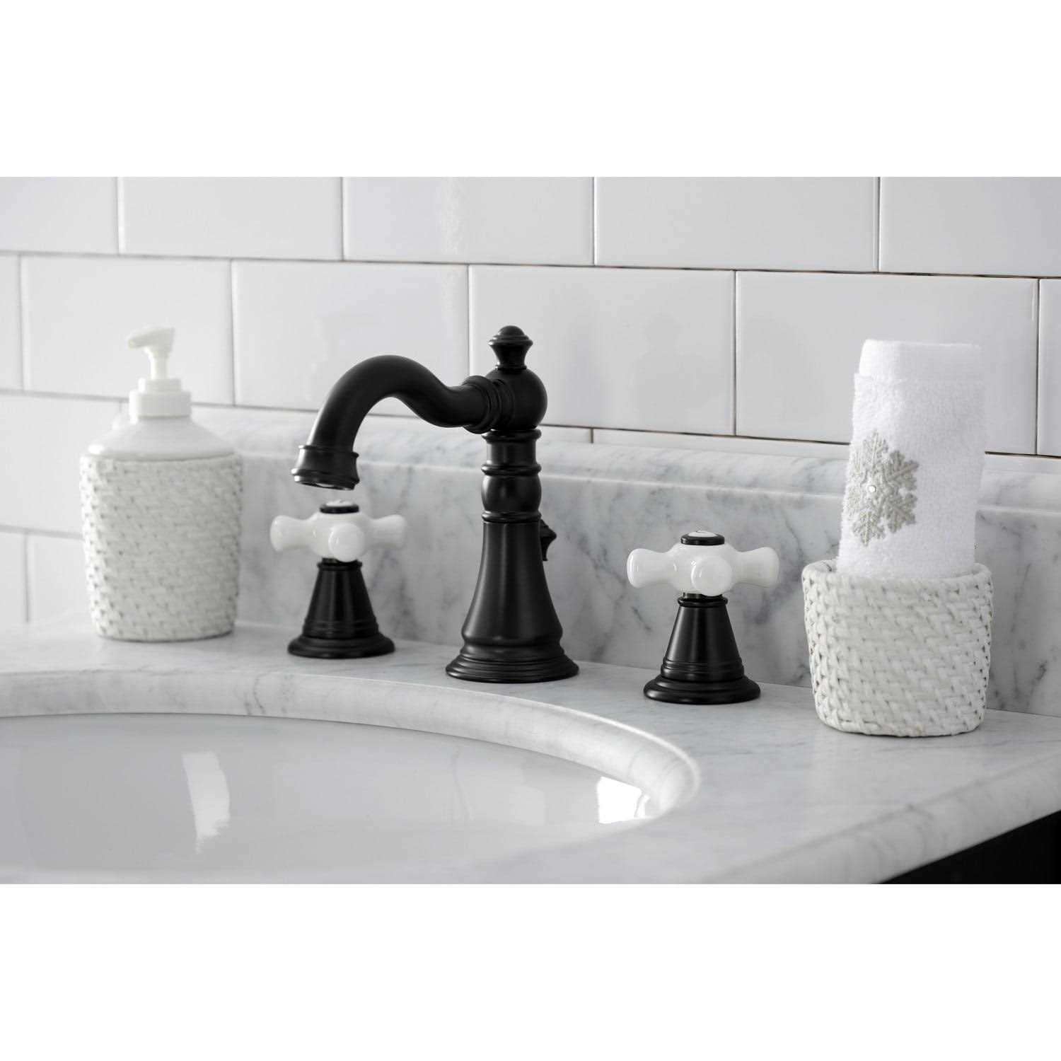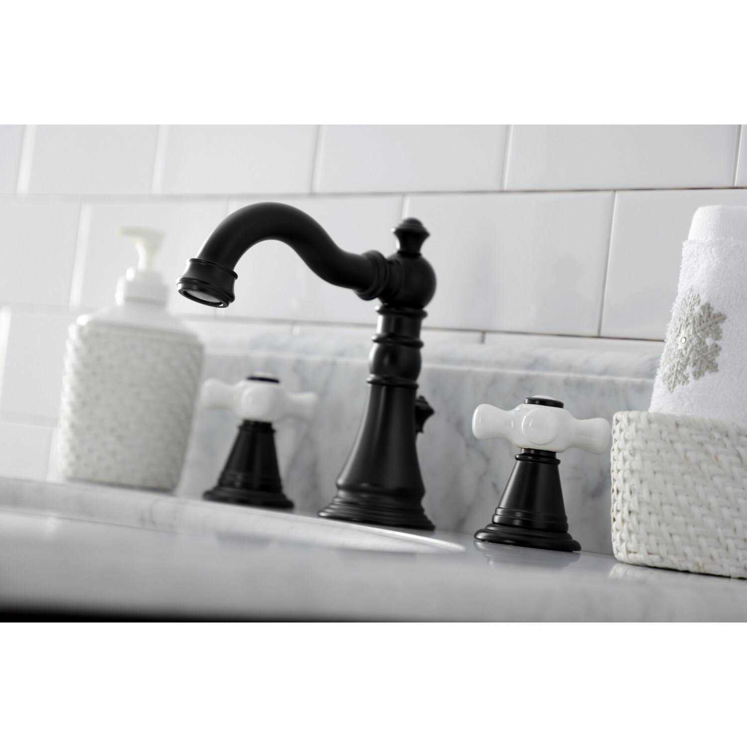 This faucet is perfect for those seeking inspiration from the exquisite artistry and architecture of the traditional Victorian era. Ideal for more spacious bathrooms, widespread faucets are more spread apart and feature a 3-hole installation. The American Classic widespread bathroom faucet with pop-up drain and its featured sturdy brass construction and premium finish are guaranteed to glamorize your home’s traditional ensemble for years to come. This faucet will surely personify any homeowner’s refined tastes with its regal qualities. A matching finish drain is also included. Solid brass construction Deck mount 8 in. to 16 in. widespread 3-hole installation 1.2 GPM/4.5 LPM water flow rate at 60 PSI 3-15/16 in. spout clearance 5-3/16 in. spout reach Dual cross handles for easy rotation Corrosion-resistant finish