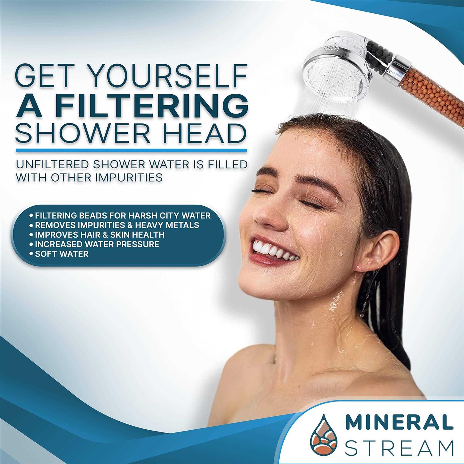 Filtered Shower Head with Handled by MineralStream High Pressure Water Saving Showerhead with Filter Beads for Hard Water with Rainfall