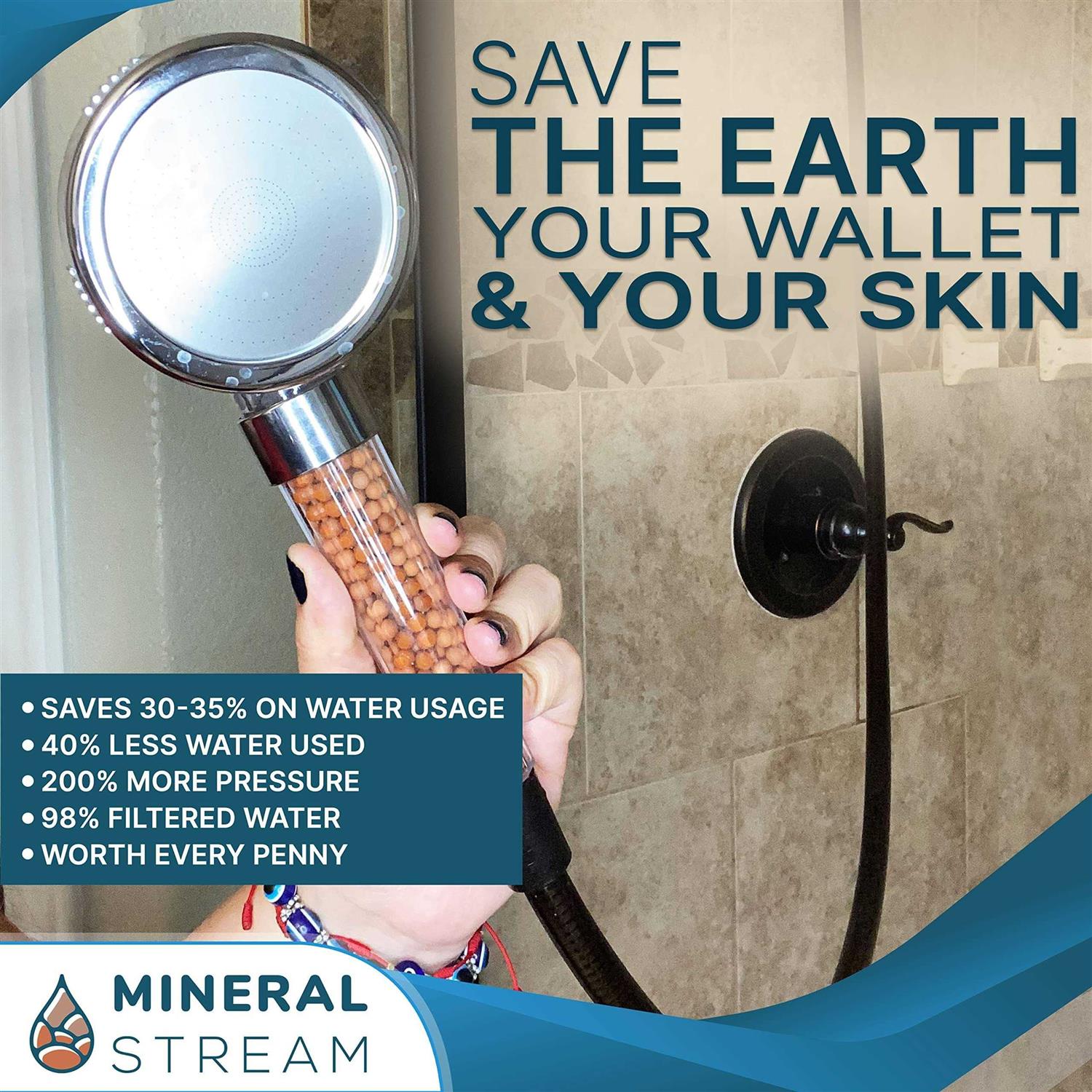 RAINFALL, JET & MASSAGE MODES: 3 spray settings are available on the MineralStream handheld shower head, including rainfall, jetting, and massage. Suitable for offering a relaxing showering experience for your families, including pets. Additionally, you can clean everywhere with the hydro jetting mode, including tile, corners, and bathrooms. FILTRATION METHOD: The water can be made cleaner by using a filtered shower head with a high-density filter system and two different types of pure natural mineral beads built in. Your skin and hair become softer and smoother because of the purifying and softening water, which also maintains the balance of your body. EASY INSTALLATION: Connects to any standard threaded shower arm in minutes, no tools required. Includes a 1.5m shower hose, hand shower holder and a shower arm diverter. STRONG SPRAY & WATER SAVING: Due to its mega hole design, the MineralStream high pressure shower head uses up to 30% less water than a standard shower head while increasing water pressure by 200%. Your entire body is enveloped in a deep, full-bodied bath that is produced by it. SUITABLE FOR EVERY HOUSEHOLD: The MineralStream has a standard connection just like other shower heads. This means that the shower head fits perfectly in 95% of households. So you don’t have to worry about installation problems. Ionic Shower Head