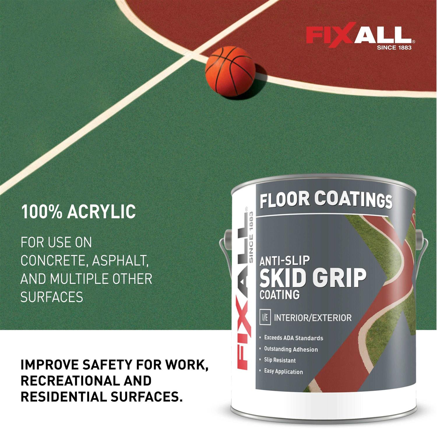 Provide your patio, pool deck, walkway and more with an extremely durable, non-slip coating using FixALL Skid Grip Anti-Slip Coating. This skid resistant pavement paint exceeds ADA standards for anti-slip surfaces making it perfect for safety areas like sidewalks, curbs and crosswalks. The fade-resistant colors remain bright through heavy use in high traffic areas for a long-lasting finish. Skid Grip offers excellent adhesion to a variety of substrates. Ensure your surface is clean and apply it with a brush, roller or squeegee. Follow all directions on label for application.