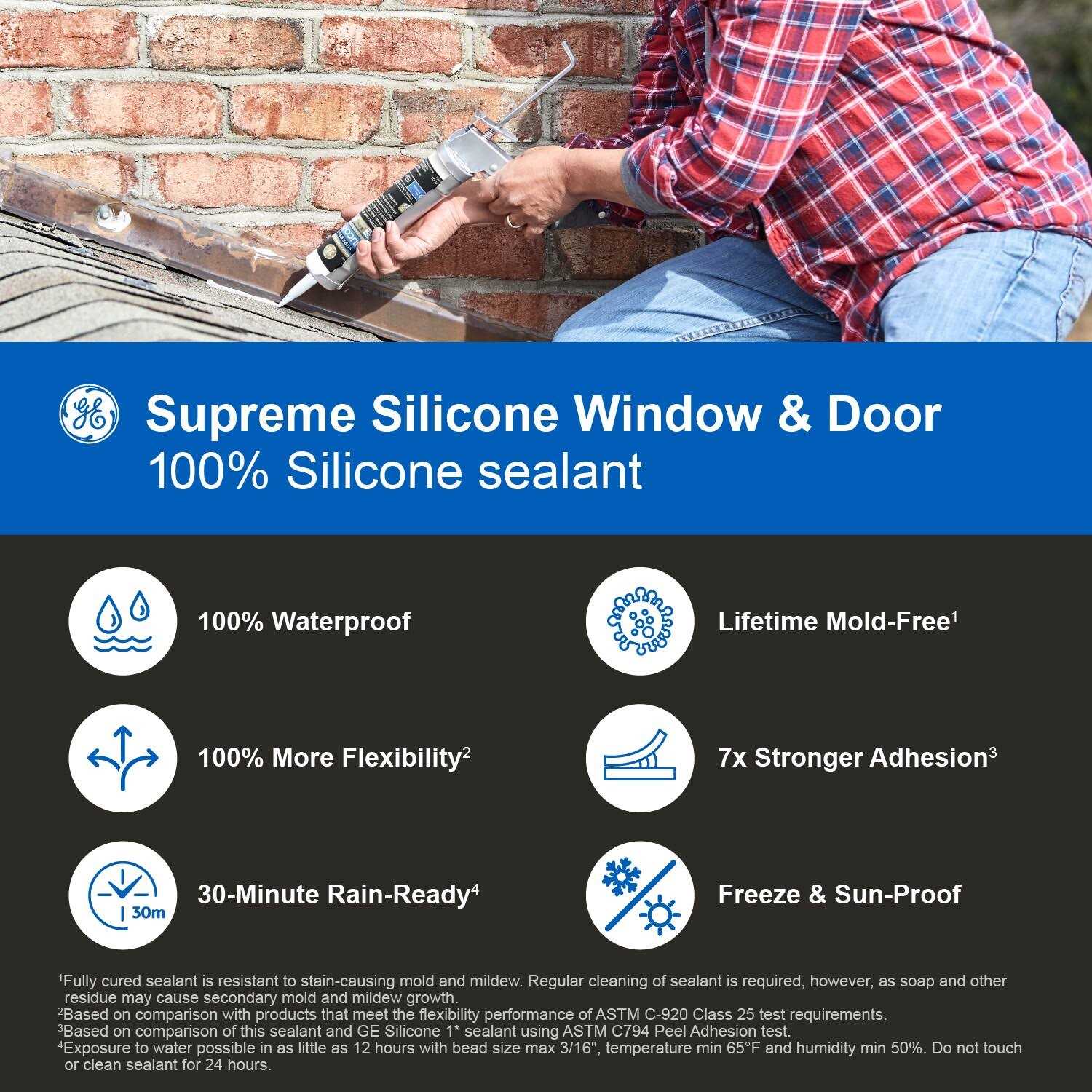 GE Supreme Silicone Window and Door sealant is a 100% waterproof sealant that can provide a reliable seal in weather-prone areas such as windows, doors, basements, roofs, sidewalks, siding, tuckpointing, and attics. Our sealant also has a 30-minute rain-ready formula and resists stain-causing mold and mildew growth. This 100% silicone sealant offers 40% more flexibility than Class 25 sealants and 7X stronger adhesion than our Silicone 1 sealant. Plus, it offers 50% joint-movement capabilities without cracking, shrinking, breaking down, or washing away. GE Supreme Silicone Window and Door sealant has a low odor that is ideal for interior applications, and it wont discolor most high-end metal finishes such as chrome, bronze, and nickel.