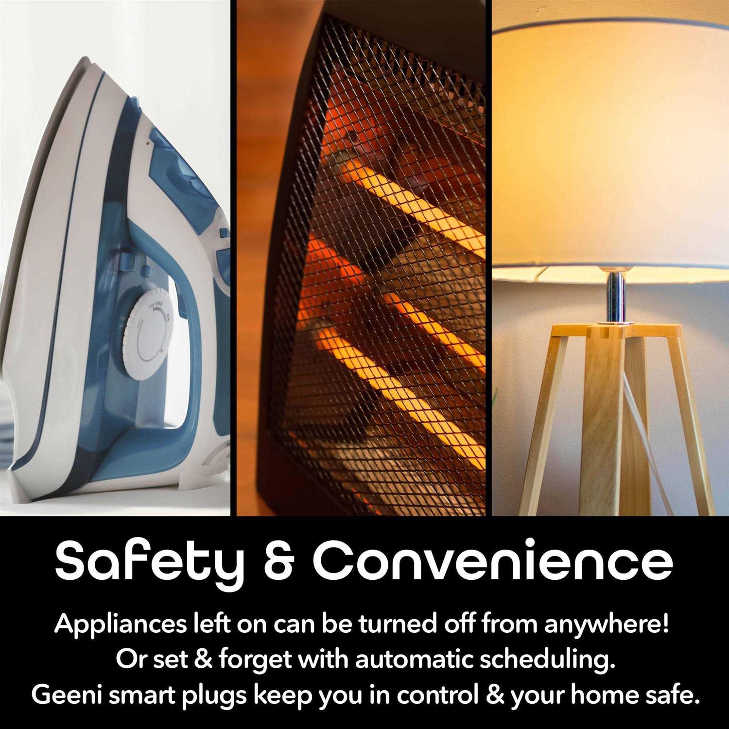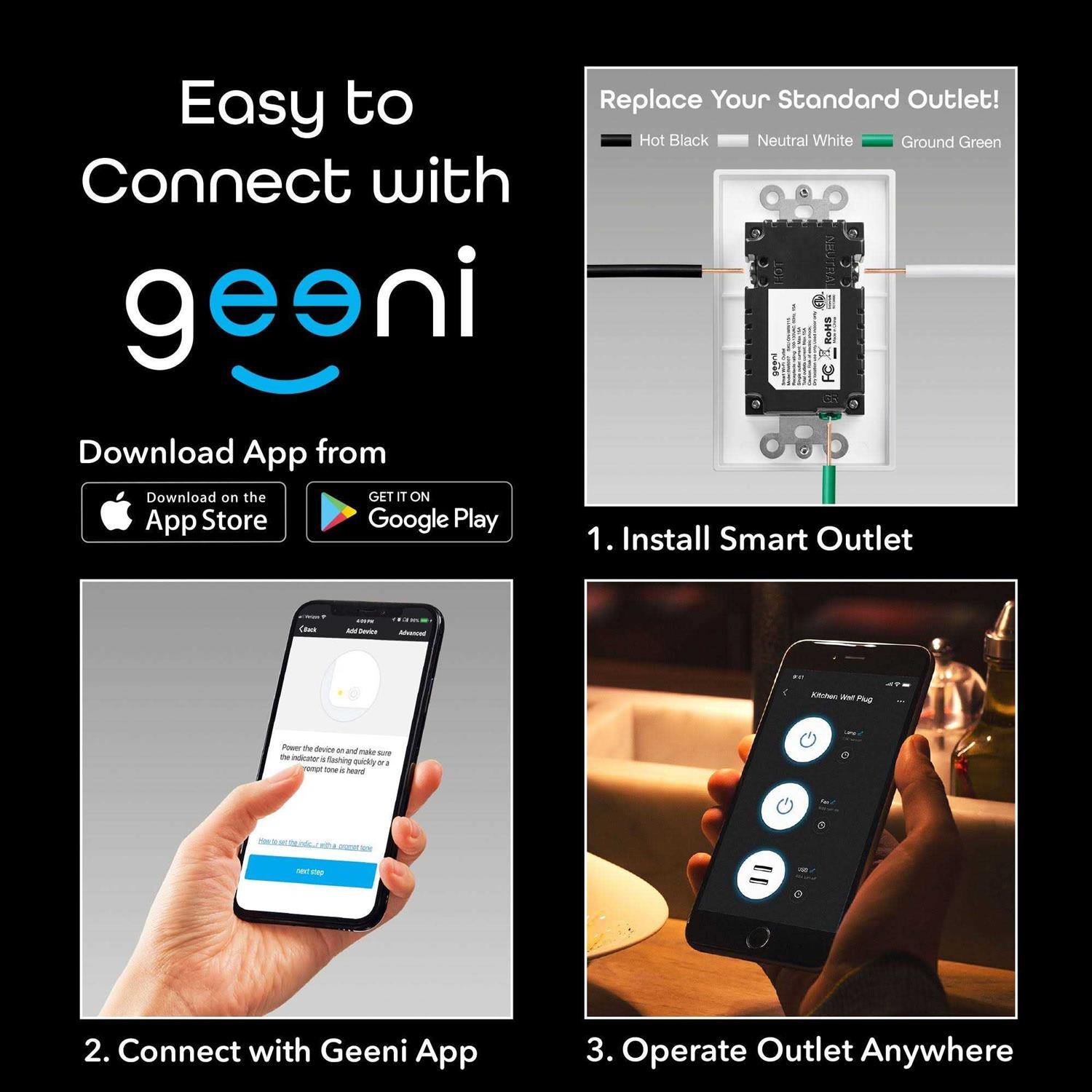 Control devices and appliances remotely with this Geeni smart outlet. Integrated Wi-Fi connectivity and the included app let you turn connected devices on and off remotely, and compatibility with virtual assistants lets you control the outlets using voice commands. This Geeni smart outlet has two built-in USB ports that accommodate phone and tablet chargers. Two standard outlets Allow you to plug in a variety of electronics and appliances. Wi-Fi connectivity Ensures reliable operation independently of bridges. Two USB ports Let you charge up to two devices at the same time. Works with Alexa, Cortana, and Google Assistant Give your outlet a unique name, and send voice commands from your device to control plugged-in appliances at the same time or individually. Built-in schedules Set your smart dimmer switch to automatically turn on and off or dim while you’re home or away. Geeni app Control your home, and manage access for family and guests from Android or iOS devices. Easy installation You can replace your existing switch in 10 minutes.