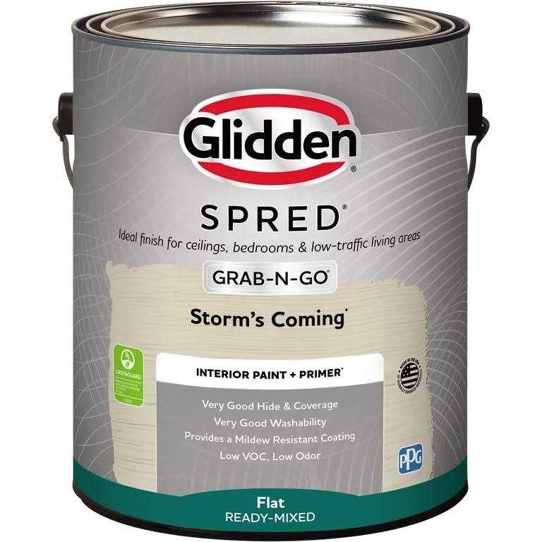 Glidden Spred Interior Paint, Storm’s Coming, Flat, 1 Gallon is a low-VOC, low-odor liquid paint and primer* all-in-one that provides very good hide, coverage, and washability. Recommended for use on properly prepared concrete/masonry, metal, drywall, plaster, and wood. Select the best sheen for your project. Flat is an ideal finish for ceilings, bedrooms and low traffic living areas. Eggshell is an ideal finish for walls in all living areas including kitchen, bathroom and living room. Semi-gloss is an ideal finish for trim and interior doors. *Separate primer or multiple coats may be required.