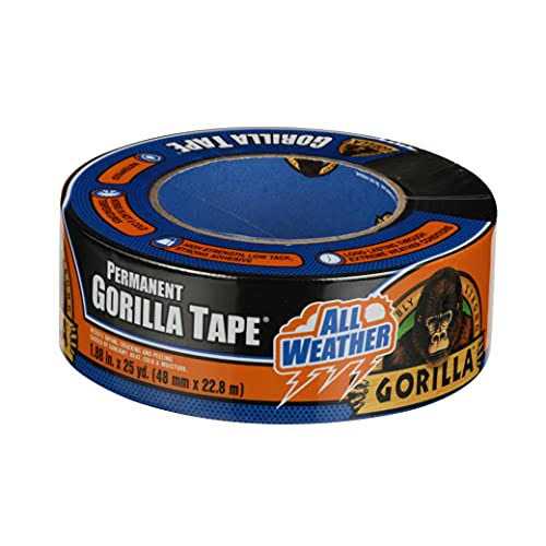 Duct Tape by Gorilla. Details:Gorilla All Weather Waterproof Tape is an ideal solution for outdoor repairs. Made with incredibly strong, permanent, butyl adhesive and a weather resistant shell, this tape withstands even extreme weather conditions. Gorilla All Weather Tape resists drying, cracking, and peeling caused by sunlight, heat, cold, and moisture and works in both hot & cold temperatures. Great for tarps, plastic sheeting, roofs, vents, RV’s, and all general purpose heavy duty repairs. Gorilla All Weather Tape contains a highly concentrated rubber based adhesive and sticks to most plastics, including polyethylene (PE) and polypropylene (PP). Gorilla All Weather Tape does not work on materials with high oil or plasticizer content, such as EPDM rubber or PVC. An acrylic tape, such as Crystal Clear Gorilla Tape, may be better suited for these materials. Gorilla All Weather Tape should NOT be used as an electrical tape. Directions: 1. Cut or tear desired amount. 2. Apply tape to a…