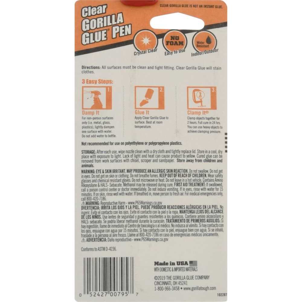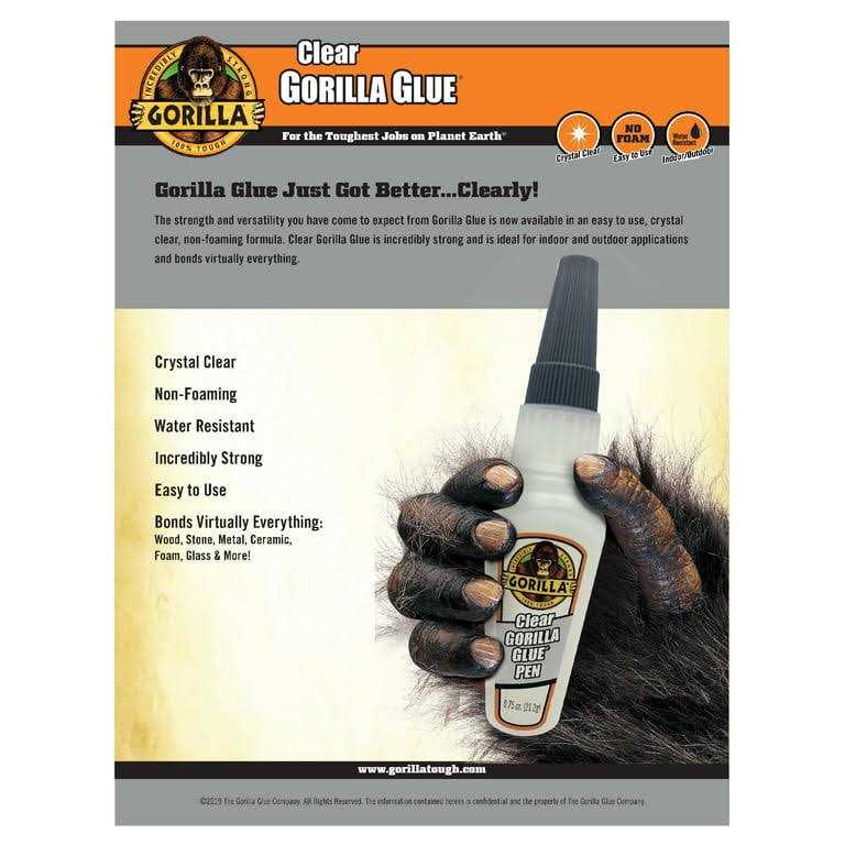 Our same Clear Gorilla Glue formula is now in a precision pen for small jobs or tight fits. The strength and versatility you have come to expect from Gorilla Glue is now available in an easy to use, crystal clear, non-foaming formula. Clear Gorilla Glue is incredibly strong, ideal for indoor and outdoor applications and bonds virtually everything. Clear Gorilla Glue is paintable, stainable, and sandable.