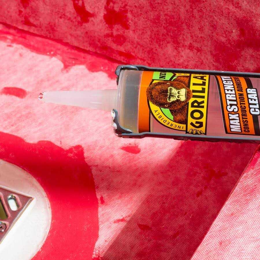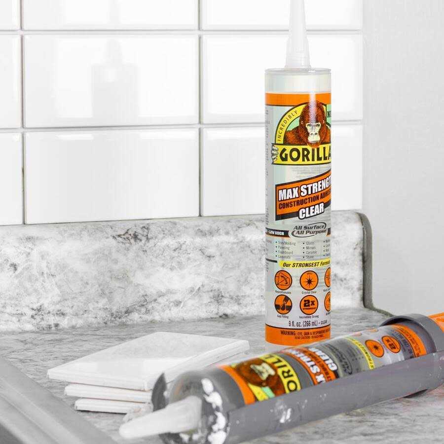 Gorilla Max Strength Construction Adhesive Clear is a tough, versatile, all-weather adhesive. It’s 100% adhesive formula provides a long-lasting, heavy duty bond. The durable, 100% waterproof formula holds up indoors and out and bonds virtually anything including subfloor, mirrors, trim, drywall, landscaping, bath surrounds, foam board, marble and more.