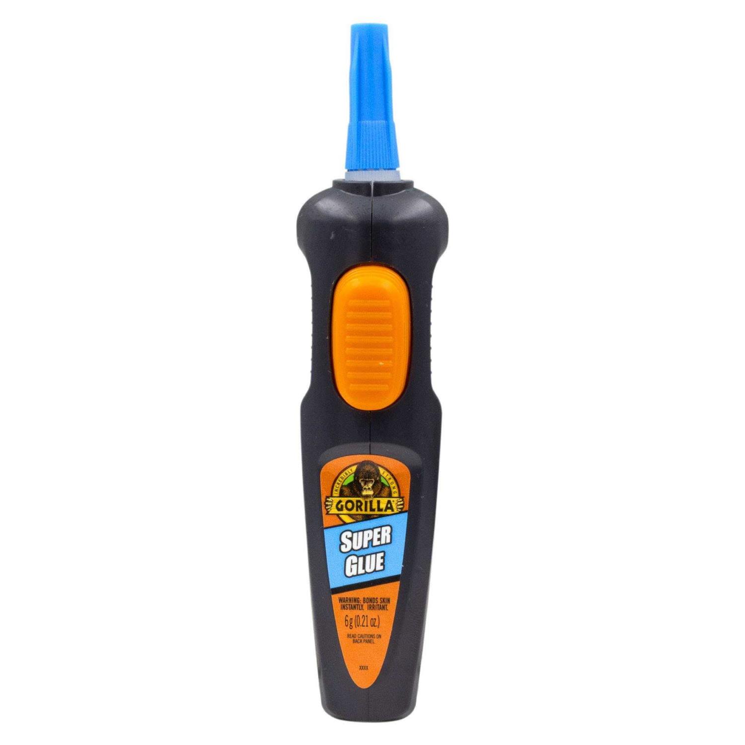 Cyanoacrylate Adhesives by Gorilla. Details:Our same strong and reliable Super Glue liquid formula, now in an intuitive pen-shaped applicator. Gorilla Super Glue Pen dispenses super glue in an uninterrupted line, providing maximum control while fitting comfortably in hand. Formulated for impact resistance and strength. Dries in 10-45 seconds, no clamping required. Anti clog cap helps keep glue from drying out. Bonds plastic*, wood, metal, ceramic, rubber, leather, paper and more! (*Not recommended for use on polyethylene or polypropylene plastic.