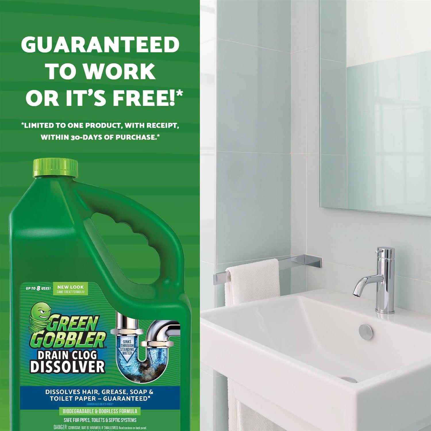 A true breakthrough in drain opener technology. The fast-acting DISSOLVE Hair Clog Gel offers superior performance over traditional drain openers. Its high density thickened formula is heavier than water so it sinks and clings to the blockage and begins working quickly. Highly effective against hair and soap scum. Green Gobbler DISSOLVE Hair Clog Gel is odorless nonflammable and safer to use than traditional drain openers like sodium hydroxide. End clogged drains and pipes once and for all! What are you waiting for? Click “Add to Cart” now and order Green Gobbler today for free-flowing drains and pipes!