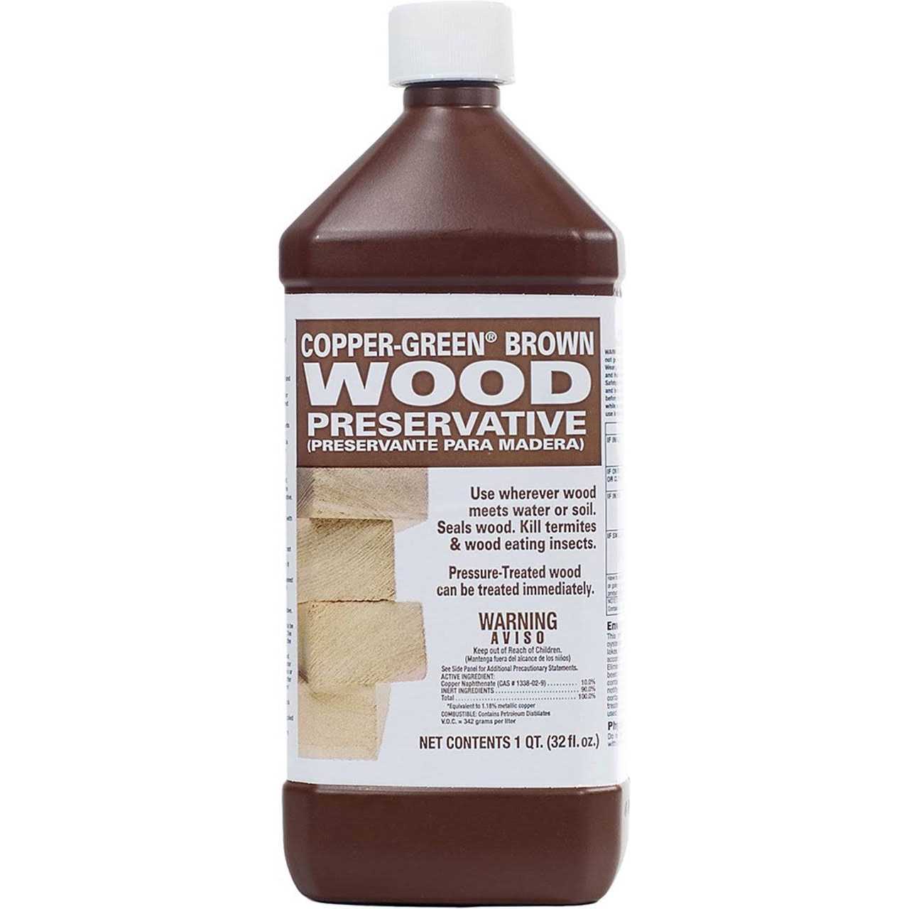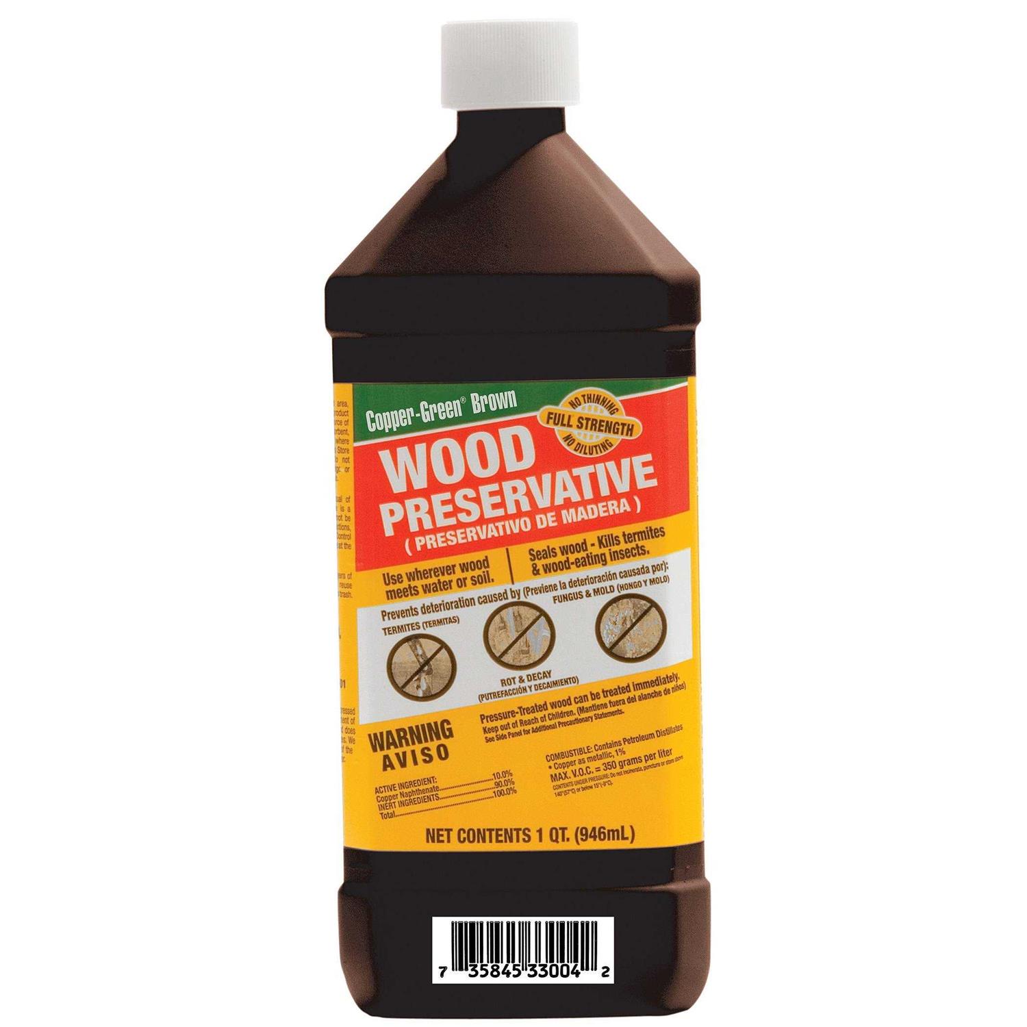 A copper naphthenate and hydrocarbon solvent wood preservative that may be brush applied for surface protection of most woods. Dip soaking or pressure impregnation of copper-green will result in deeper penetration resulting in longer preservation of treatable species. The copper in copper-green reacts with the cellulose of wood. As a result it is not easily lost from the wood by leaching. This formulation extends the service life of wood products. Use to prevent deterioration of wood caused by mold, rot and decay. Prevents shrinking, warping or cracking. Can be painted with oil based paints and primers. Repels water. Available in 1-quart bottle.