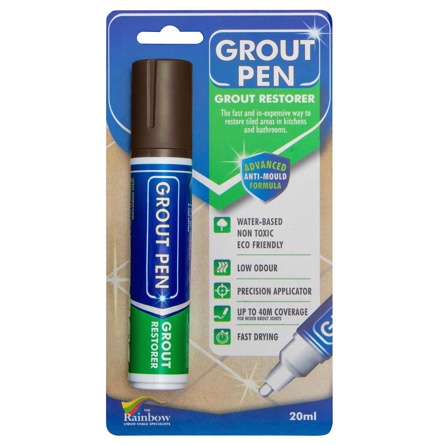 Restores Tile Grout and leaves them looking clean and protected Change Colour of your Tile Grout Lines 2 pens Cover up to 120 meters of 2mm width grout lines Anti-bacterial agents help prevent mould from re-appearing Ideal for floors & walls in Kitchens and Bathrooms This Grout ink formula is water based and covers over stained areas that are caused by everyday mould and dirt build up on grout between tiles. Not only does this product restore the grout’s look it also helps prevent further moulding with its anti-bacterial formulation. Product Specifications 5mm bullet nib reversible. Water based & non – toxic. Anti – bacterial & anti – fungal formula. Safe to use in enclosed areas. Covers 60 meters of grout area. Water resistant. Valve activated to control ink flow. For use on all types of wall & floor grout.