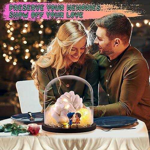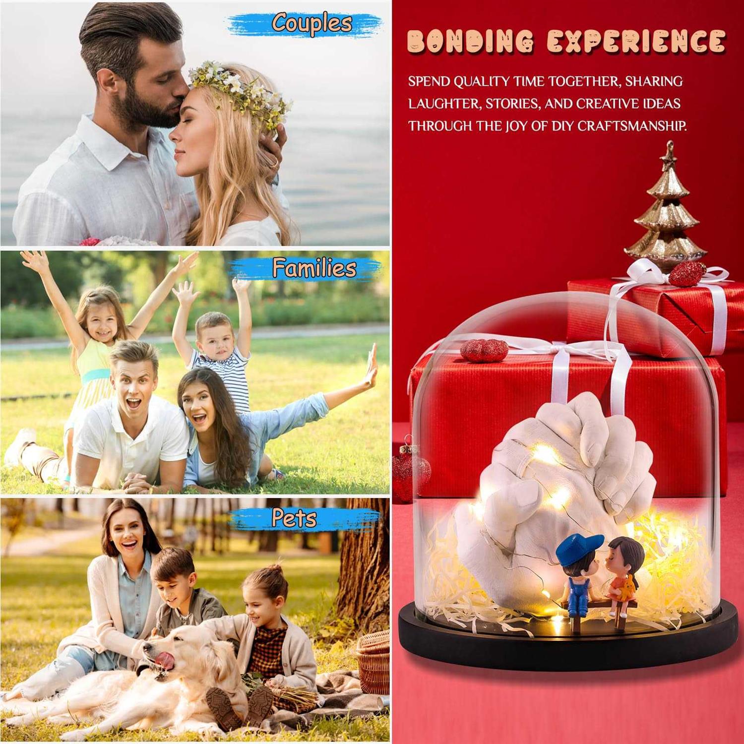 Hand Casting Kit – DIY Hand Plaster Mold Kit, Includes Glass Dome Cloche with String Lights, Wooden Base and Paint Set, Gift & Keepsake for Couples,