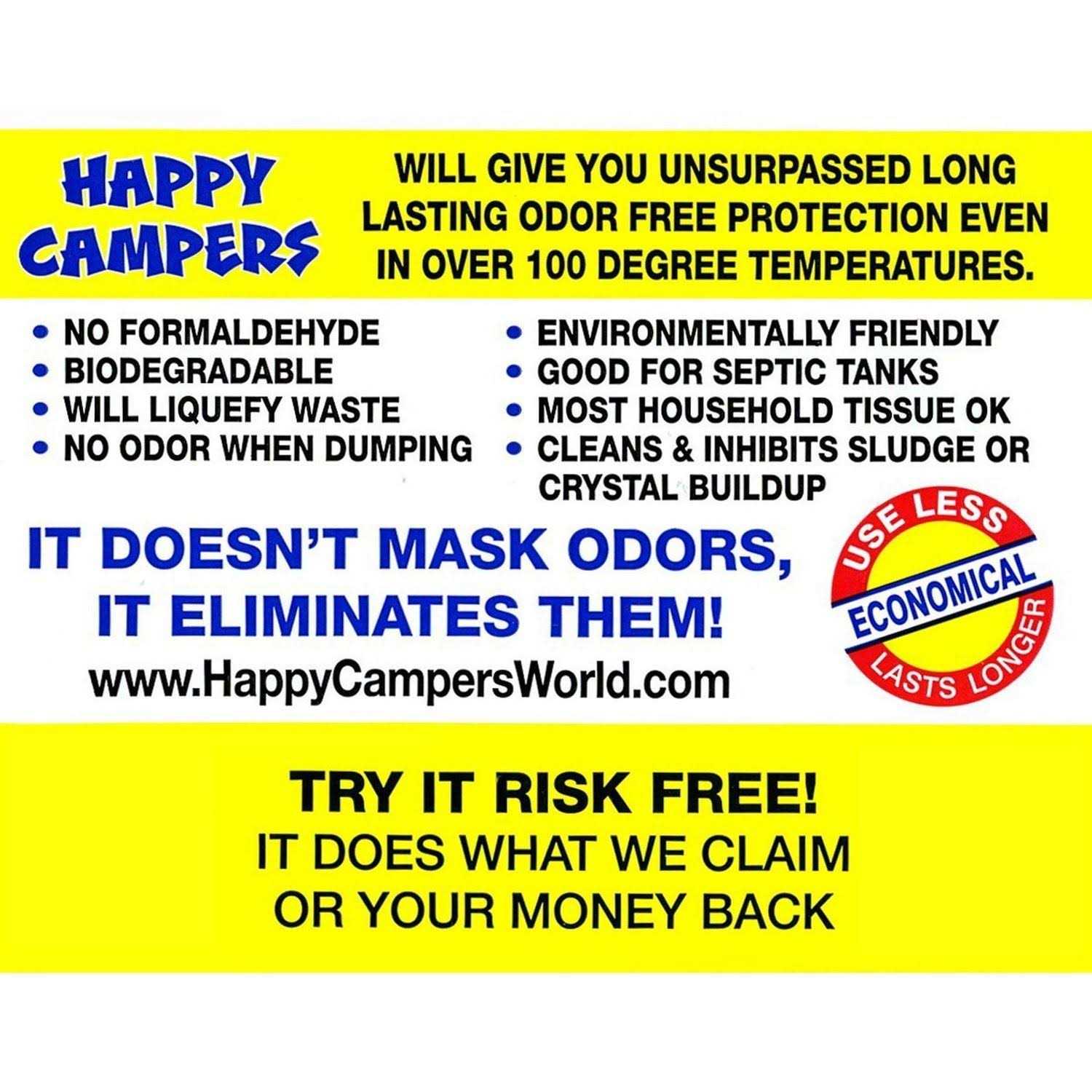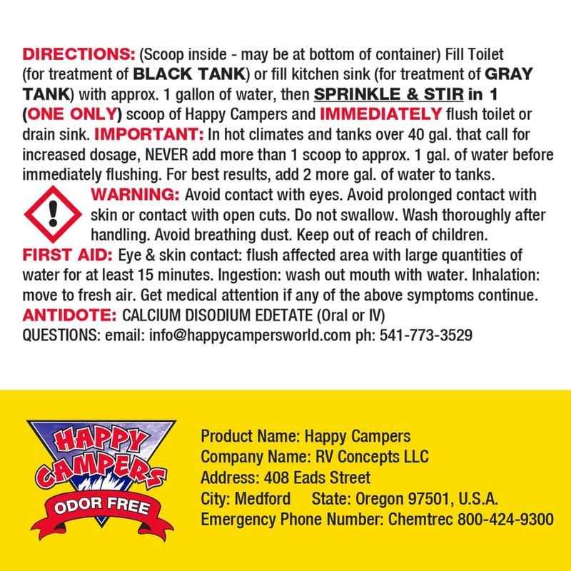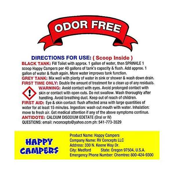 Environmentally Friendly Happy Campers products are environmentally friendly made up of a completely safe blend of concentrated natural minerals and micro nutrients that are good for septic tanks. This unique blend is biodegradable, uses absolutely NO formaldehyde or dangerous chemicals and digests waste as well as most household tissue. Reduces Maintenance Costs The Happy Campers natural holding tank treatment is designed to work in extreme climates and last longer than any competitive RV holding tank deodorizing product on the market. Compare Happy Campers effectiveness yourself to see just how effective Happy Campers is at eliminating holding tank odors as well as saving you money and time while doing it. Happy Campers will eliminate odors not only in your RV’s black water and gray water holding tanks, but will eliminate odors even in your washing machine! If you can’t get a bad smell out of your clothes, just add a scoop of Happy Campers without soap – you’ll like the results. Find out for yourself, why so many people are using and loving Happy Campers Odor Eliminator. ODOR FREE: Eliminates odors in the RV holding tank. If theres a problem, message us! It says it all.