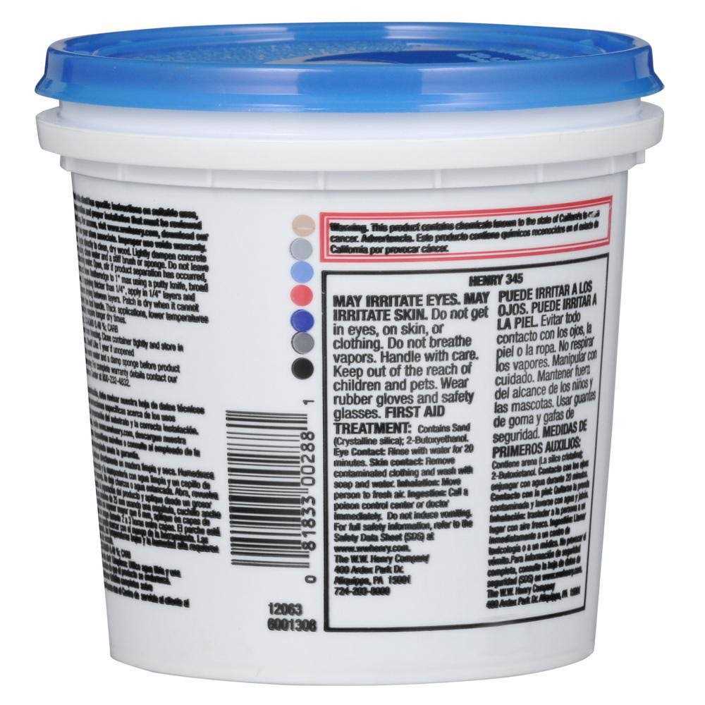 Henry 345 Premixed Patch N’ Level, ready-to-use flooring patch for smoothing and repairing interior and exterior concrete, wood, and masonry. Fast drying premixed formula dries in only 2 to 3 hours. No primers or additives needed. Apply directly to clean, dry wood. Lightly dampen concrete and masonry using clean water and a stiff brush or sponge. Do not leave puddles or standing water.