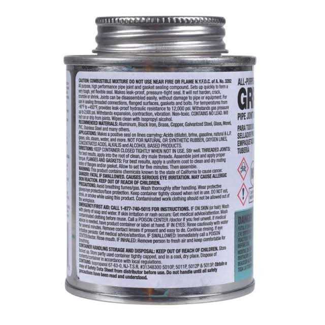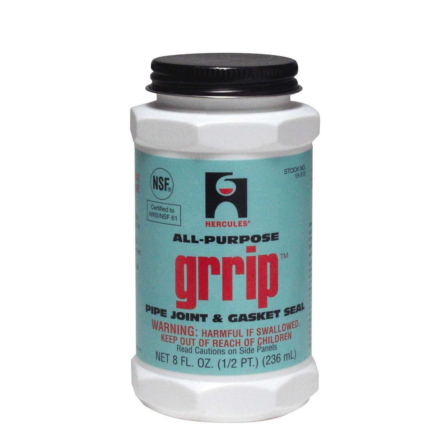 Hercules GRRIP is an all purpose, non-petroleum, hydrocarbon based pipe joint and gasket seal for use on all metals and on PVC, ABS, CPVC plastics. GRRIP sets up quickly and dries to form a very tough, yet flexible seal which will not harden, crack, crumble or shrink. Provides leakproof resistance to high pressure, temperature, expansion, contraction and extreme vibration. Joints can be disassembled easily, without damage to pipe or equipment. GRRIP can be removed from skin or clothing, tools or equipment with isopropyl alcohol or Hercules For Hands hand cleaners. GRRIP is applied easily with the natural bristle brush even at temperatures as low as +20 deg F and performs over a temperature range of -90 to 450 deg F. It provides leakproof hydraulic resistance to 12,000 psi and withstands gas pressure 2600 psi. GRRIP is a black colored thread sealant which contains no lead.