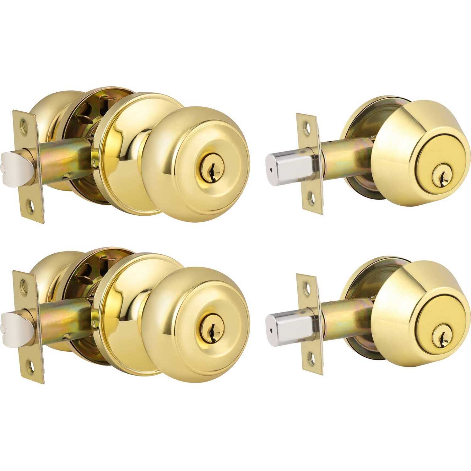 Polished Brass Keyed Entry Door Knobs with Single Cylinder Deadbolt Set [PRODUCT FEATURES] The entry door knob and deadbolt set comes with keyed alike entry, enabling all locks to be opened with one key (up to 2 sets of locks), and a single cylinder deadbolt with a keyed outside and turn button inside. The set is constructed from solid steel and includes a polished brass door knob set. [APPLICATION] The set is designed for use on exterior doors that require keyed entry and security. Its modern contemporary style complements a wide range of interior and exterior doors, making it perfect for both commercial and residential applications. [ADJUSTABLE LATCH] The adjustable latch of the set allows for flexibility in installation, with the option to set it to either 2-3/8″ or 2-3/4″ (60mm-70mm). It can fit standard door thicknesses ranging from 1-3/8″ to 1-3/4″ (35mm-45mm), ensuring that it is compatible with a wide variety of doors. [EASY INSTALLATION] The installation process is quick and easy, and requires just a door and a tool set. There is no need for professional door fitters, as the set can be installed easily by yourself. The simplicity of the installation process ensures that you can set up the lock set without any difficulty. [MODERN DESIGN DOOR LOCKSET] The sleek and modern design of the lockset enhances the appearance of any room, providing a contemporary touch while also ensuring privacy and security.