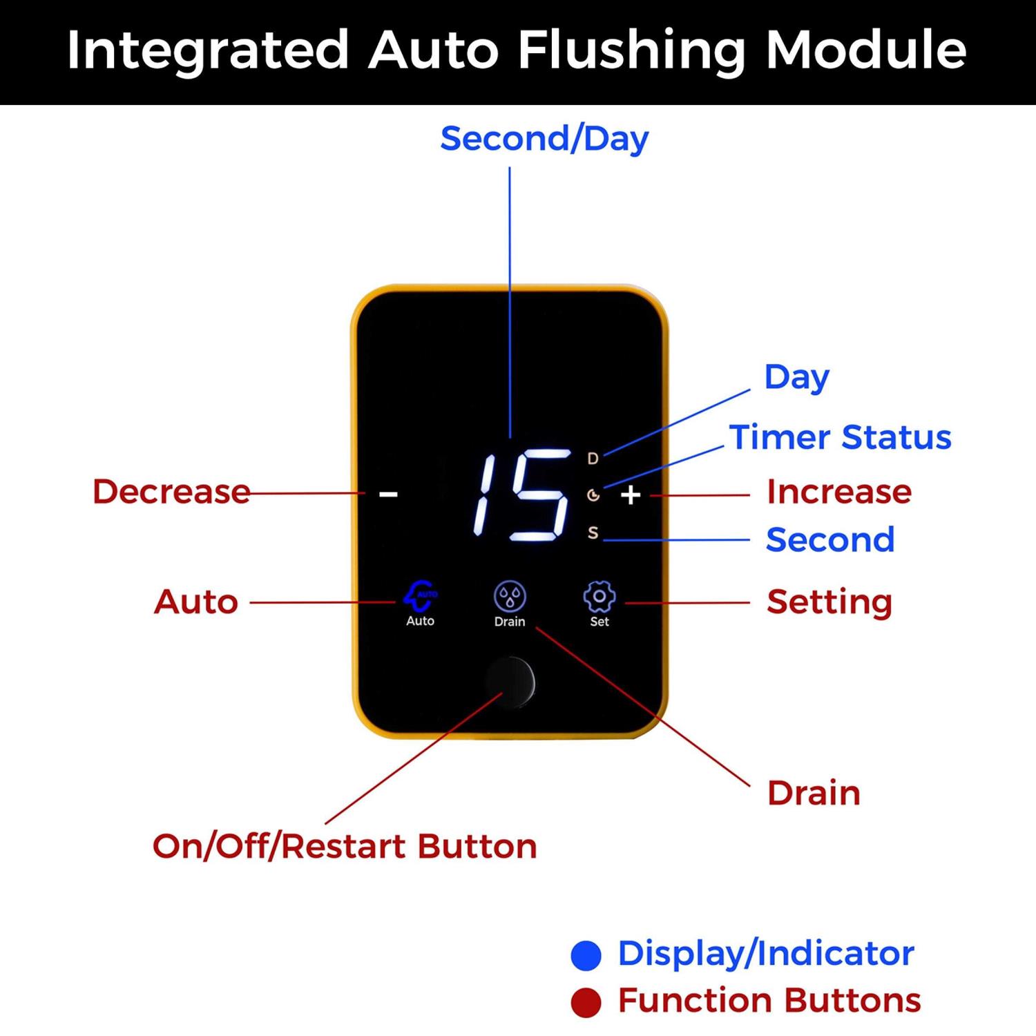 The WSP50ARB spin-down sediment filter is a central water purification pre-filter to protect your terminal equipment and appliances such as downstream pipelines, water purifiers, water heaters, wall-hung boilers, dishwashers, washing machines, and showerheads. It protects and extends the life of your standard filters by removing the large dirt, sand, and rust particles before they reach the rest of your plumbing system. An integrated Auto Flushing Module enables the system to flush automatically on a preset schedule. Use the HD touch screen to adjust flushing frequency, ranging from 1-99 days, and flush runtime(choose from 15, 30, 45, 60, or 90 seconds). Thanks to its size(nearly double the size of our WSP50 series) and auto flushing module(easy maintenance), WSP50ARB takes water purification as well as plumbing and appliances protection to the next level. The WSP50ARB filter is self-cleaning and reusable. A toggle switch allows particles and contaminant buildup trapped in the filter to be flushed out without having to shut down the water supply first. The system is preset to flush for 15 seconds every 15 days. It is recommended to flush at least once a week for 30 seconds each time, depending on the water usage, sediment amount, and the hardness level in your source water. It is recommended to clean the filter cartridge after it has been used continuously for 8-12 months. Simply remove the stainless steel filter mesh and clean it with a brush or soak it in vinegar.