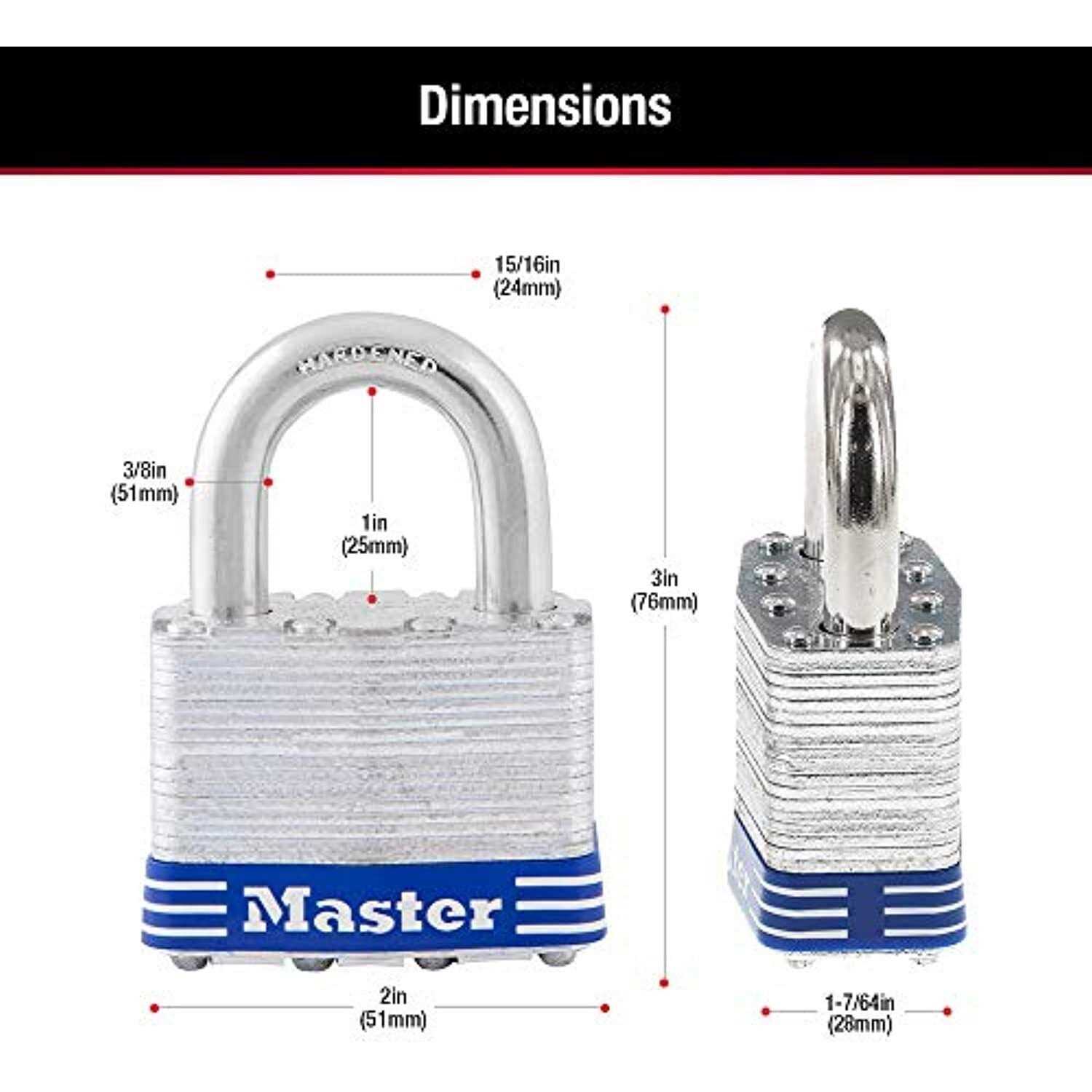 - 2 in. (51 mm) wide lock body; 3/8 in. (10 mm) diameter shackle with 1 in. (25 mm) length, 15/16 in. (24 mm) width