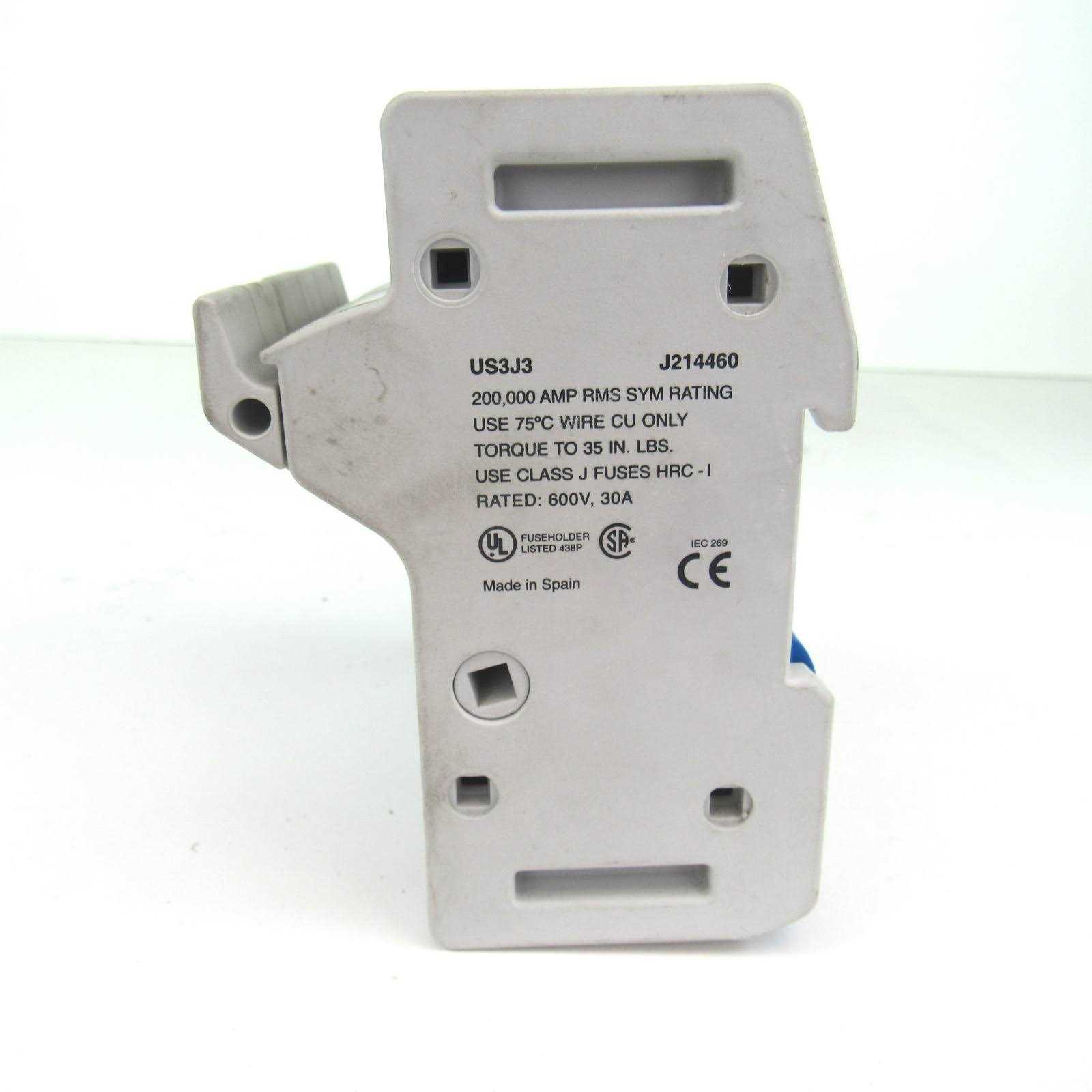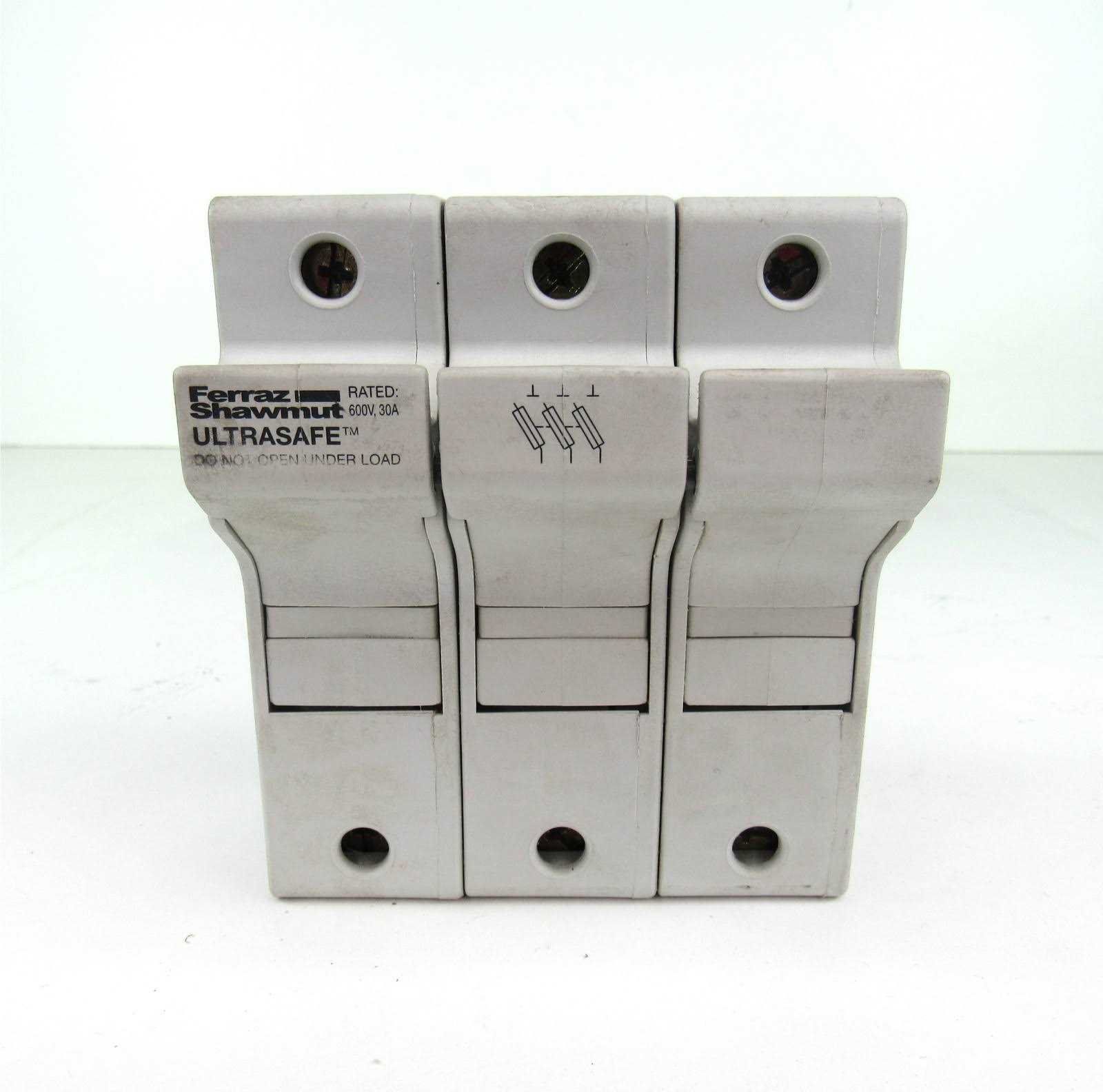 Mersen Ultrasafe USCC Series Finger safe fuse holder with visual indication, features tough, durable polyamide body and tin-plated copper contact for longer endurance. It withstands voltage rating of 600 Volt AC/DC. This 3-Pole fuse holder with pressure plate terminal connection, accommodates solid/stranded wire of size 6 – 14 AWG. It measures 3.07 Inch x 2.07 Inch x 2.32 Inch. Fuse holder with fuse size of 30 Amps, supports DIN-rail mounting for saving panel building time. It is ideal for use with ATDR, ATMR and ATQR Class CC fuses. Fuse holder withstands temperature rating of -40 to 85 deg C. Fuse holder is UL listed, CSA certified and RoHS compliant.
