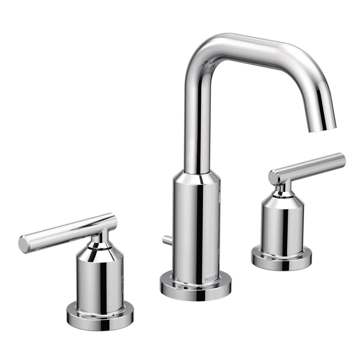 Chrome two-handle bathroom faucet. The gibson collection gives contemporary industrial design a softer point–of–view. The tubular spout and handles mirror the look of exposed piping while polished edges create a chic and modern style.Chrome finish is highly reflective for a mirror-like look that works with any decorating style Two-handle lever handles make it easy to adjust the water Built on the moen m-pact common valve system, allowing you to update the faucet style in the future without replacing any plumbing Faucet handles can be installed at any distance between 8″ to 16″ for a more customized widespread installation Complies with americans with disabilities act (ada) specifications Aerated flow is ideal for everyday bathroom tasks, like brushing teeth and washing hands Meets EPA watersense criteria to conserve water without sacrificing performance Includes red and blue markings Limited lifetime warrantyADA Compliant: Yes Collection: Gibson Countries of Origin: US Finish: Chrome Flow Rate: 1.2 GPM (4.5L min) max. Height: 3 Length: 15-3 5 Tier Height: 14-1 4 Tier Length: 47-3 52 Tier Quantity: 42 Tier Weight: 184.8 Tier Width: 41-3 8 Watersense: Yes Weight: 4-4 5 Width: 11-8 9