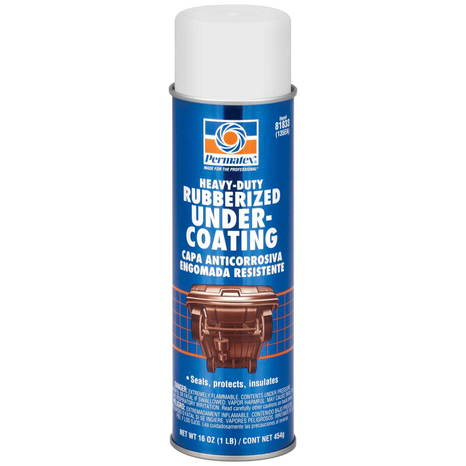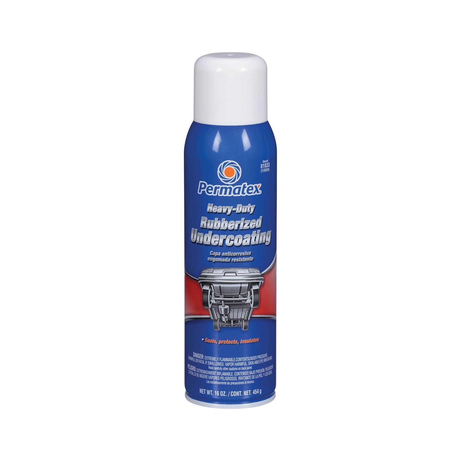 Permatex 81833: Undercoating, Heavy-Duty Rubberized, 16 oz., Each – Permatex heavy-duty rubberized undercoating is ideal to protect, seal, and insulate vehicle frames and so much more! This improved, professional blend can be applied not only to undercarriage components, but also to rocker panels and wheels. Around the house, use Permatex to seal roofs, gutters, and drain systems. The all-purpose rubberized coating provides a smoother finish than other similar products. Clean your surface before spraying, and allow 24 hours to dry.