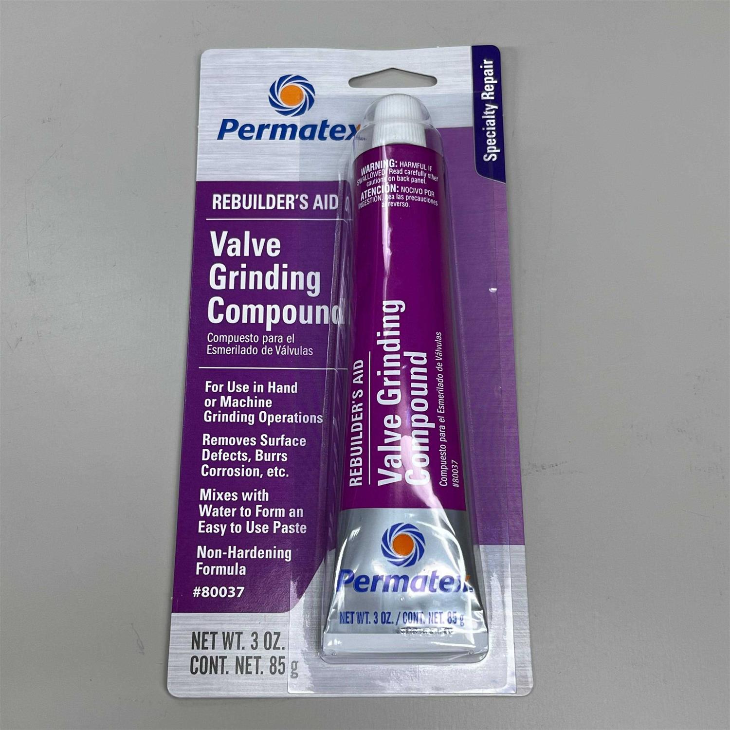 Permatex Valve Grinding Compound aids valve grinding and seating operations to remove burrs, surface defects, carbon, gum and corrosion. It can be used for lapping and grinding chromium. Mixes with water to form an easy-to-use paste. Made for the professional.