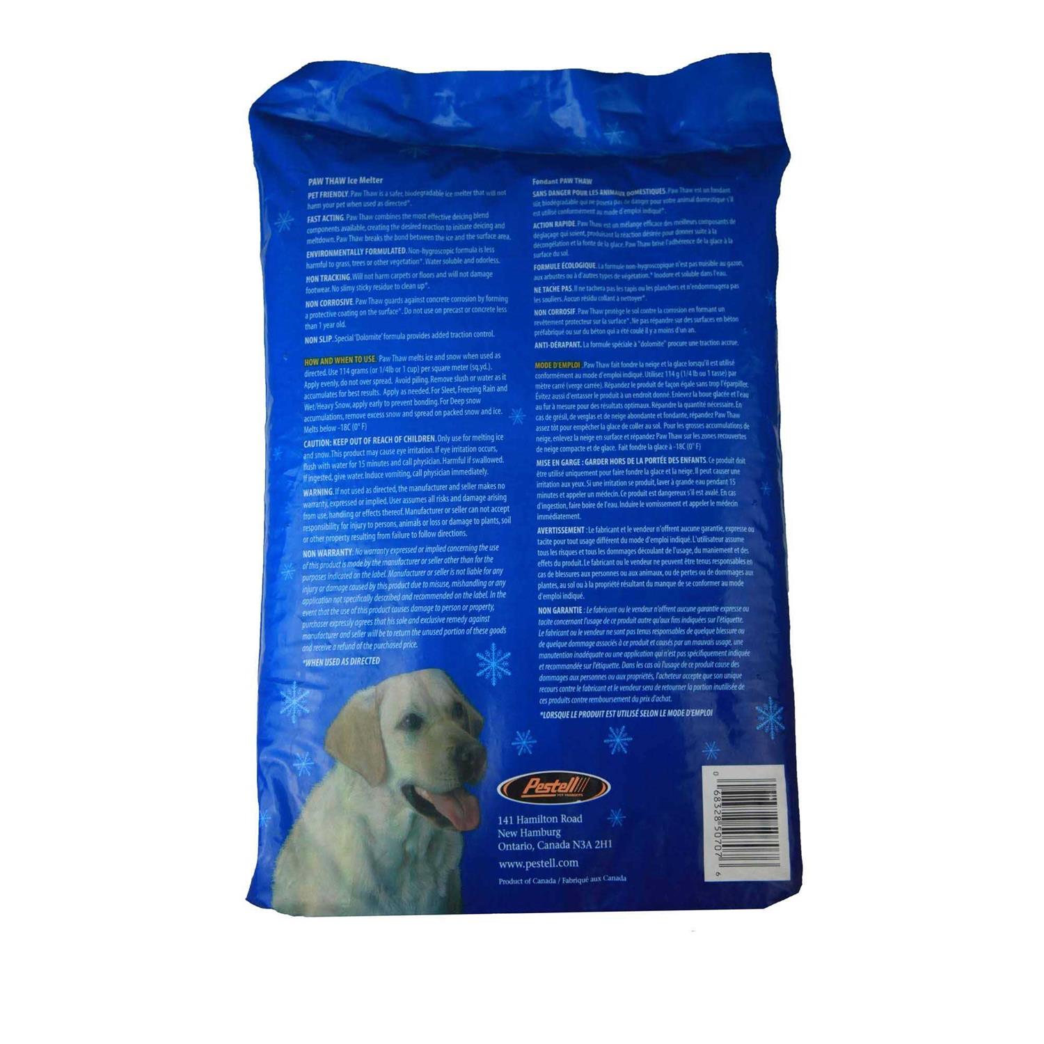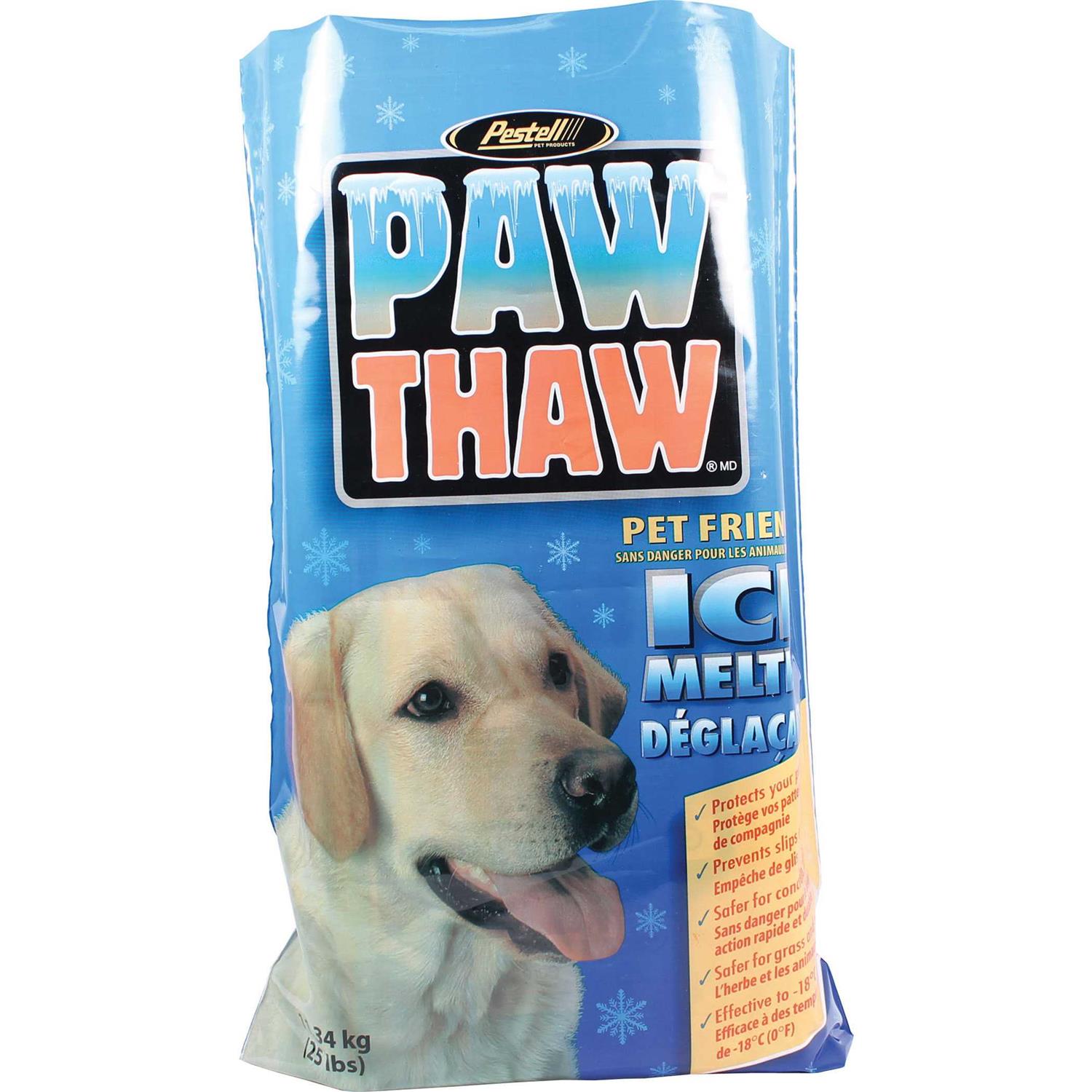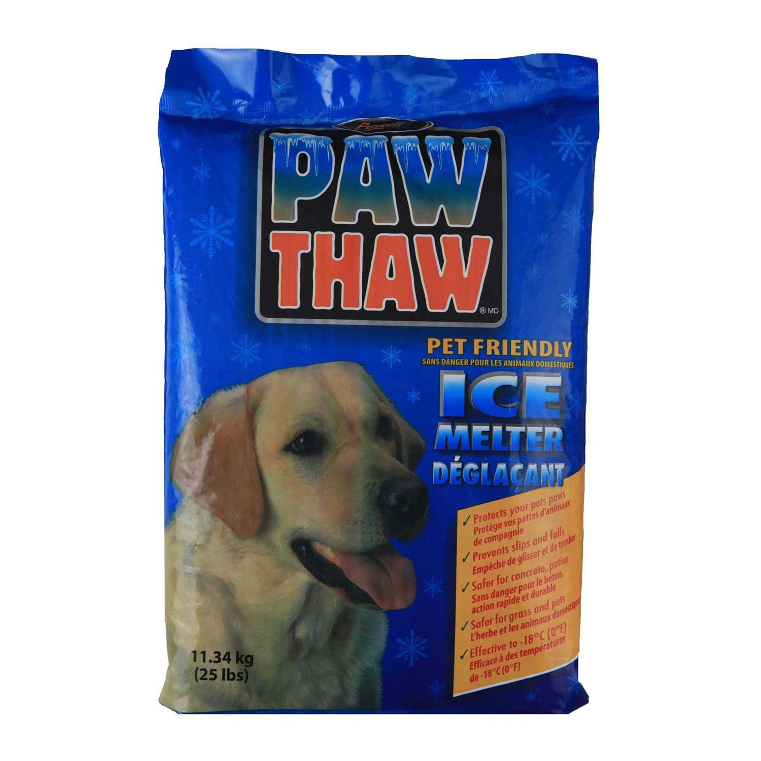 Paw Thaw is a safer biodegradable ice melter that will not harm your pet when used as directed. Paw Thaw combines the most effective deicing blend components available creating the desired reaction to initiate deicing and meltdown. Paw Thaw breaks the bond between the ice and the surface area. The Non-hygroscopic formula is less harmful to grass trees or other vegetation. Water soluble and odourless. Will not harm carpets or floors and will not damage footwear. No slimy sticky residue to clean up. Paw Thaw guards against concrete corrosion by forming a protective coating on the surface. Do not use on precast or concrete less than 1 year old. Special Dolomite’ formula provides added traction control.
