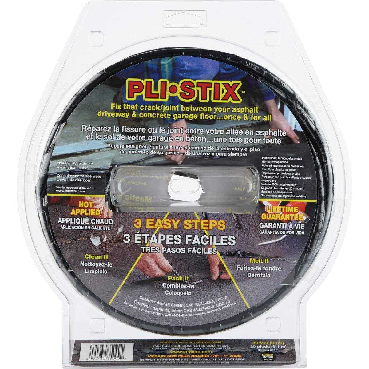 Latexite brings to you the Pli-stix medium 1/2 inch black permanent asphalt crack filler, the only permanent solution to cracks available on the marketplace. This black product is the same product seen on highways and roads, but the only difference is that you can apply this joint filler and don t need a 200-gallon melter to do it. The medium Pli-stix is a joint and crack filler for cracks of 1/2 to 1 inch in diameter. The coverage area of the Latexite crack filler is 30 linear feet. There is zero VOC. The Pli-stix crack filler is a permanent repair and comes with a lifetime guarantee. Just apply the joint and crack filler in the crack or joint and heat it with a heat gun or propane torch. It is 100% watertight seal and makes your drive traffic-ready in 20 minutes. This crack joint filler can be used on asphalt, expansion joints of asphalt to concrete, and the concrete itself.