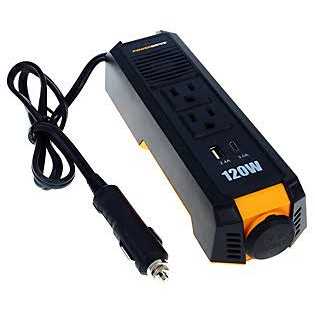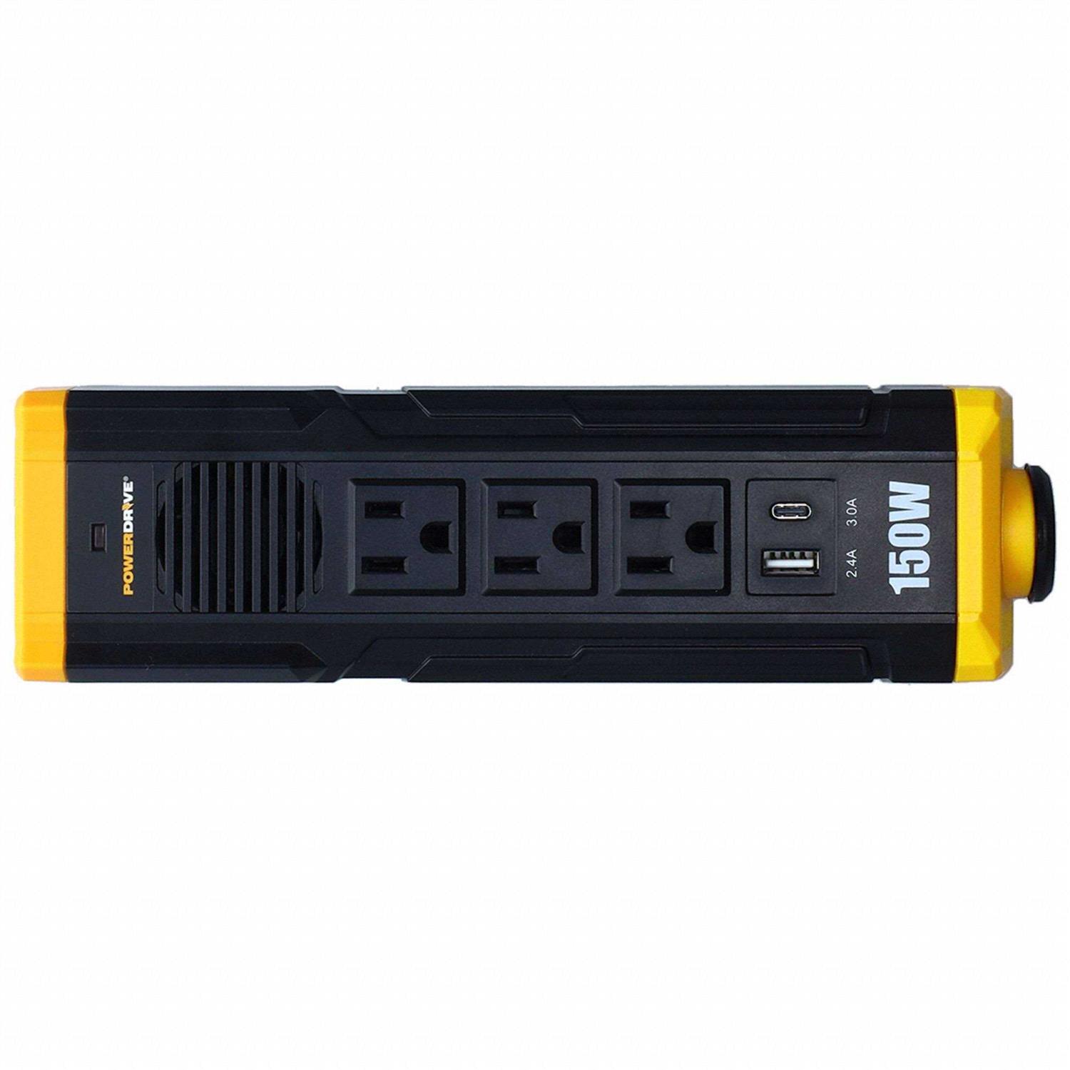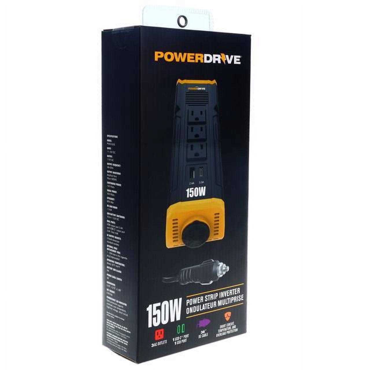 Place the PowerDrive 150W power strip inverter in the your car or truck socket 12v port and power AC devices up to 150 watts. (Surge power to 300 watts.) This car power inverter provides DC to AC power while you travel. Long 36-inch power cable lets you reach a nice distance to your devices and appliances from the cigarette lighter socket port. Looks like a standard electrical power strip but you get a source of DC to AC power from three 3-prong AC outlets and two USB ports. Great functionality while you are on the go. Recharge your drone or laptop and other devices using your vehicle battery with this 12v power strip. Includes 3-foot cord.