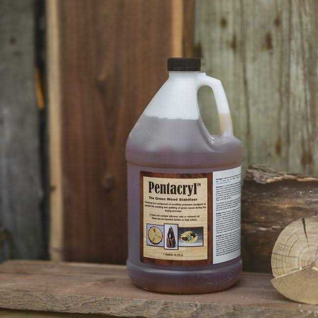 Combats the negative effects of drying by displacing water and moisture in the wood fibers Doesn’t stain the wood or affect finishing in any manner Drying time reduced by as much as 90% with Pentacryl Your wood will dry quicker and more evenly Pentacryl residue even lubricates your tools as you work Carving or turning green wood is certainly faster and easier than working with dry stock. But sometimes the extra work involved with slowly and carefully drying the wood to avoid checking hardly seems worth the trouble. Not any more! Pentacryl is a revolutionary new product that combats the negative effects of drying by displacing water and moisture in the wood fibers. Your wood will dry quicker and more evenly, and the Pentacryl residue even lubricates your tools as you work. This non-toxic solution doesnt stain the wood or affect finishing in any manner. The recommended method of application is total immersion, but the product can also be brushed or sprayed. Compared to the traditional wax coating method, youll find the drying time reduced by as much as 90 with Pentacryl. On average, a green 6″ x 6″ x 2″ bowl blank would absorb 2 ounces of solution, be fully saturated in a week, and, if turned thin, dry in about three weeks.