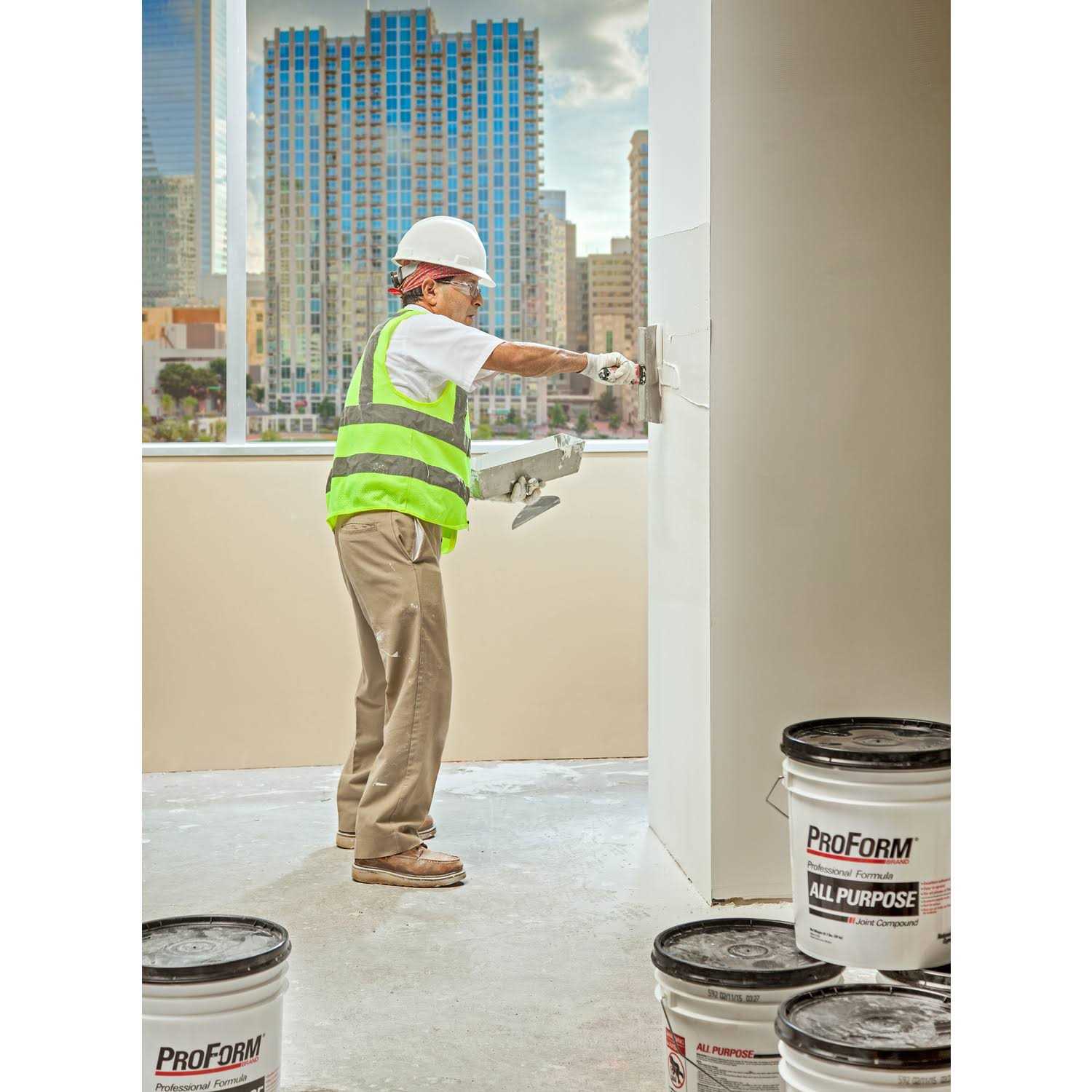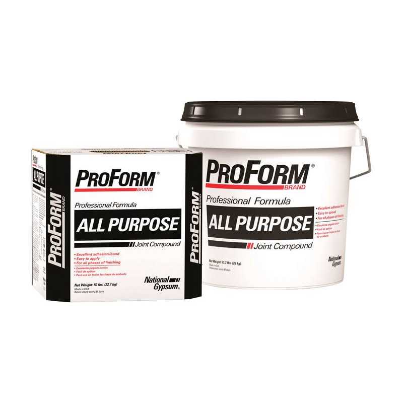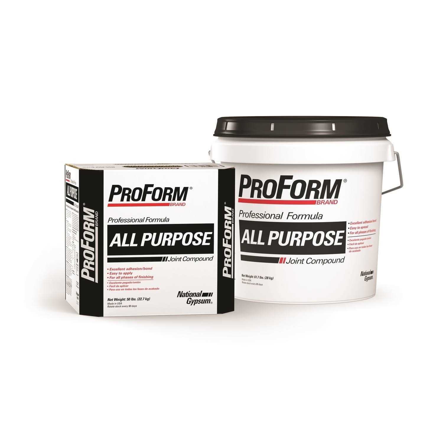 ProForm All Purpose Joint Compound is a vinyl base ready mix joint compound for the professional that may be used directly from the container. All Purpose Joint Compound is designed for tape application, fastener spotting, and complete joint finishing of gypsum board. It can also be used to repair cracks in plastered walls, to texture surfaces, and to laminate gypsum board to other surfaces such as masonry or other gypsum board. It contains enough binder to secure the reinforcing tape and develops its strength and hardness by drying.