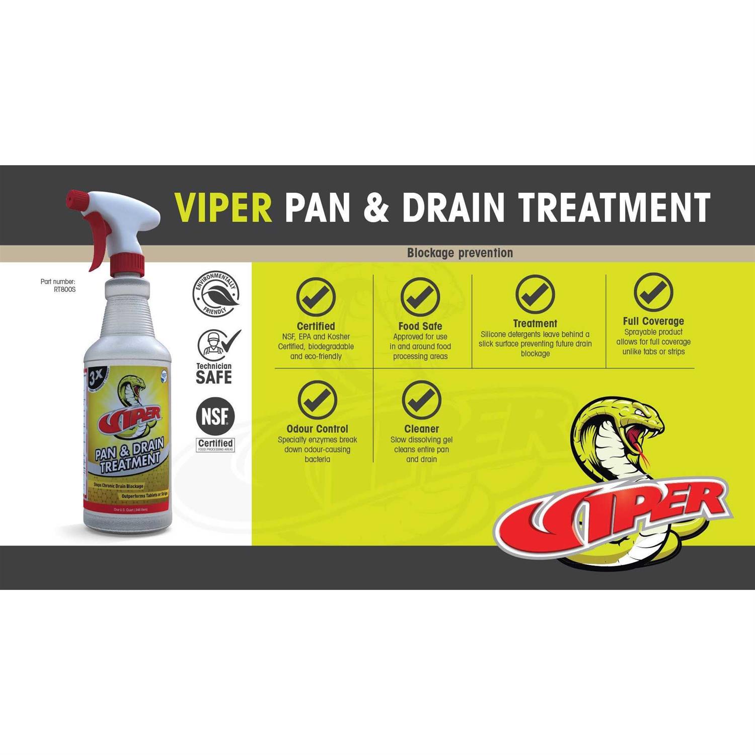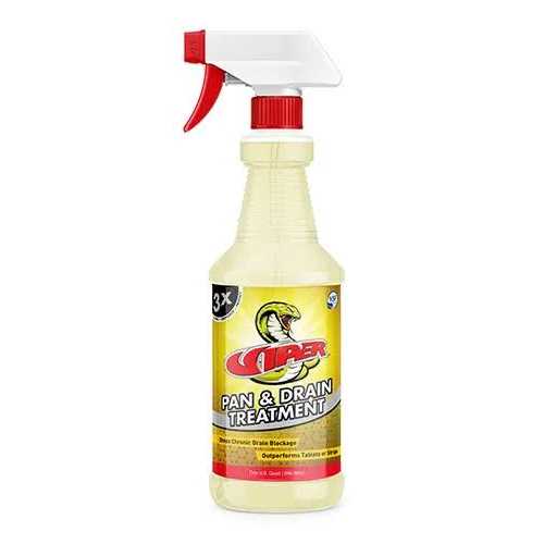 Industrial Lubricants by Refrigeration Technologies. Details:Viper Pan and Drain Treatment is a spray gel that contains enzymes and silicone detergents. The enzymes will penetrate and break through the solid layers of slime, sludge and sediment. The silicone detergents coat the pan, p-trap and drain piping lubricating to improve flow and prevent future soil adhesion. The slow dissolving gel will outperform and outlast conventional tablets and strips.