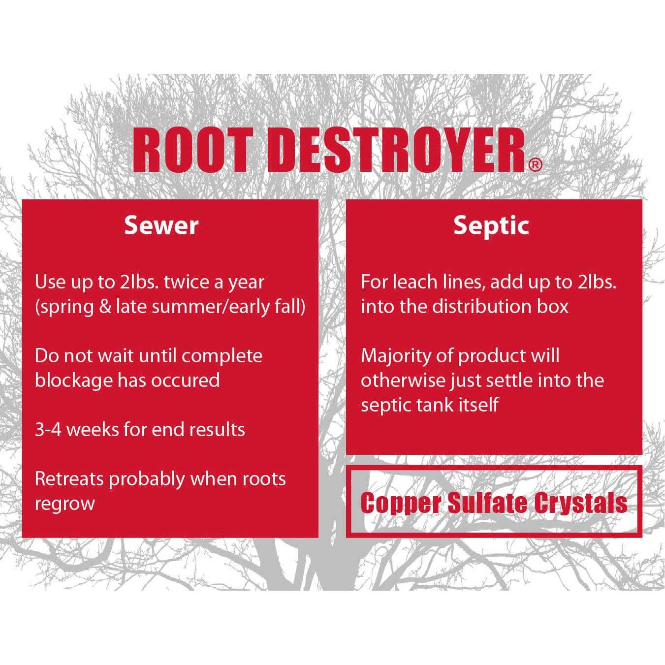 Made up of copper sulfate crystals that will kill invasive septic and sewer pipe roots without harming your tree. In 1/2 lb. increments, pour Root Destroyer into the toilet bowl nearest the sewer line and flush; repeat this process until the recommended dose has been added Root Destroyer will temporarily reduce bacterial action, but will return to normal approximately 15 days after treatment. Only roots inside the leach line will be killed. Do not apply through sink or tub drains. Use Root Destroyer at the rate of 1 lb. in an active 150 gallon septic tank 2 twice a year or anytime you have reduced water flow thought to be caused by root growth occurs. Made up of copper sulfate crystals that will kill invasive septic and sewer pipe roots without harming your tree. Root Destroyer will temporarily reduce bacterial action, but will return to normal approximately 15 days after treatment. Only roots inside the leach line will be killed.