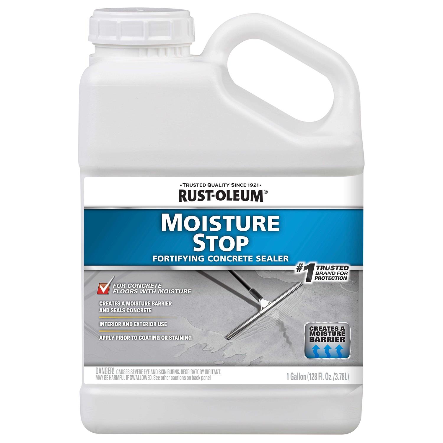 Rust-Oleum Moisture Stop penetrates into concrete and reacts with the free calcium and water to form a gel in cracks, pores, and capillaries to protect against the ingress of water and contaminants. This allows surfaces that were previously uncoatable due to moisture, to be coated. Strengthens and seals from the inside out. Dries to touch in 45 minutes. For use with all concrete coatings. Soap and water clean-up.