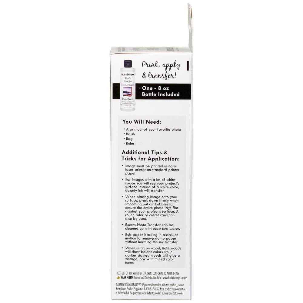 RUST-OLEUM 8 oz photo transfer transforms your favorite laser print image into a personalized home decor piece or photo gift. Create a craft, memorable custom gift, collectible or photo memory on wood, paper, canvas, fabric or even glass, with images of any size for a rustic farmhouse look. Photo transfer also works great with handwriting or text for a truly unique outcome.