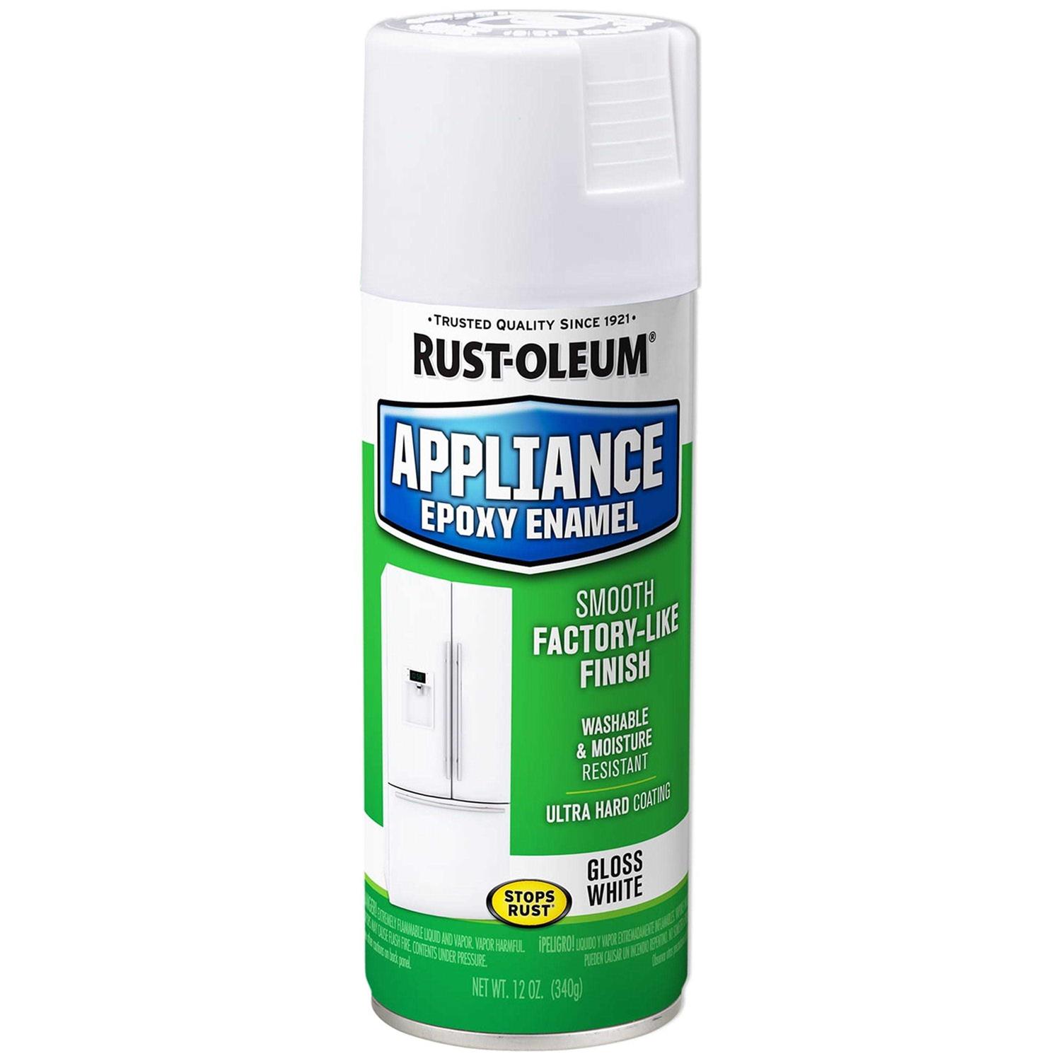 White Rust-Oleum Specialty Appliance Epoxy is an ultra-hard, moisture resistant 12 ounce spray enamel that is specifically formulated for indoor metal surfaces. It provides a smooth, washable surface for refinishing the exterior of appliances such as refrigerators, dishwashers, laundry machines, and other indoor metal applications such as cabinets and tables. Do not use on objects exposed to heat such as stovetops, oven interiors, etc. Indoor use only. For best results spray on 2 or 3 light coats a few minutes apart; no primer needed.