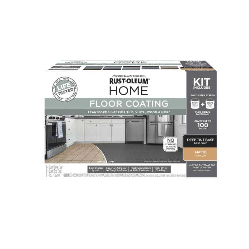 Rust-Oleum Home Interior Floor Coating System provides revolutionary technology in an extremely durable coating for a variety of indoor floors. 2-Step Paint Floor System consists of a separate Base Coat and Top Coat to update the look of any room, with Life Tested durability against fading, scratches, stains, spills and messes. Easy to use transformation requires no stripping, sanding or priming. Use to paint tile, wood floors, vinyl, laminate, concrete, bare concrete and more. Remodel nearly any interior floor in one day with no messy demo using a floor paint designed for foot traffic featuring maximum scratch and stain resistance. Color: Deep Tint Base.