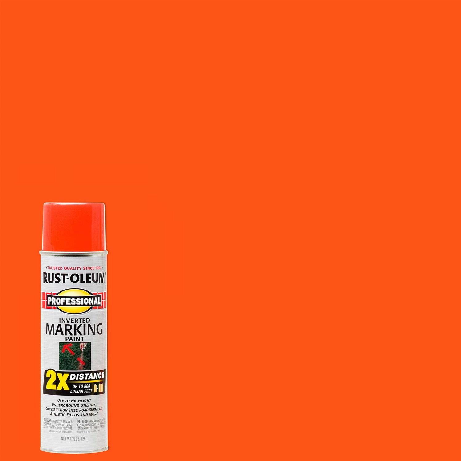 Fluorescent Red-Orange, Rust-Oleum professional distance inverted marking paint is designed to mark gravel, soil, grass, concrete and blacktop. This no-mess aerosol produces easy-to-follow marks that are great for underground utilities, athletic fields, landscaping and more.Offers 2x the distance of regular professional marking paints. Mark up to 800′ per can. Dries to the touch in 15 minutes.
