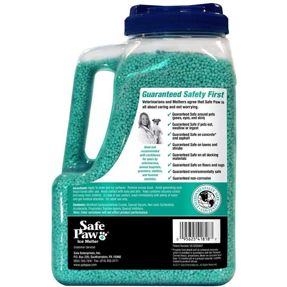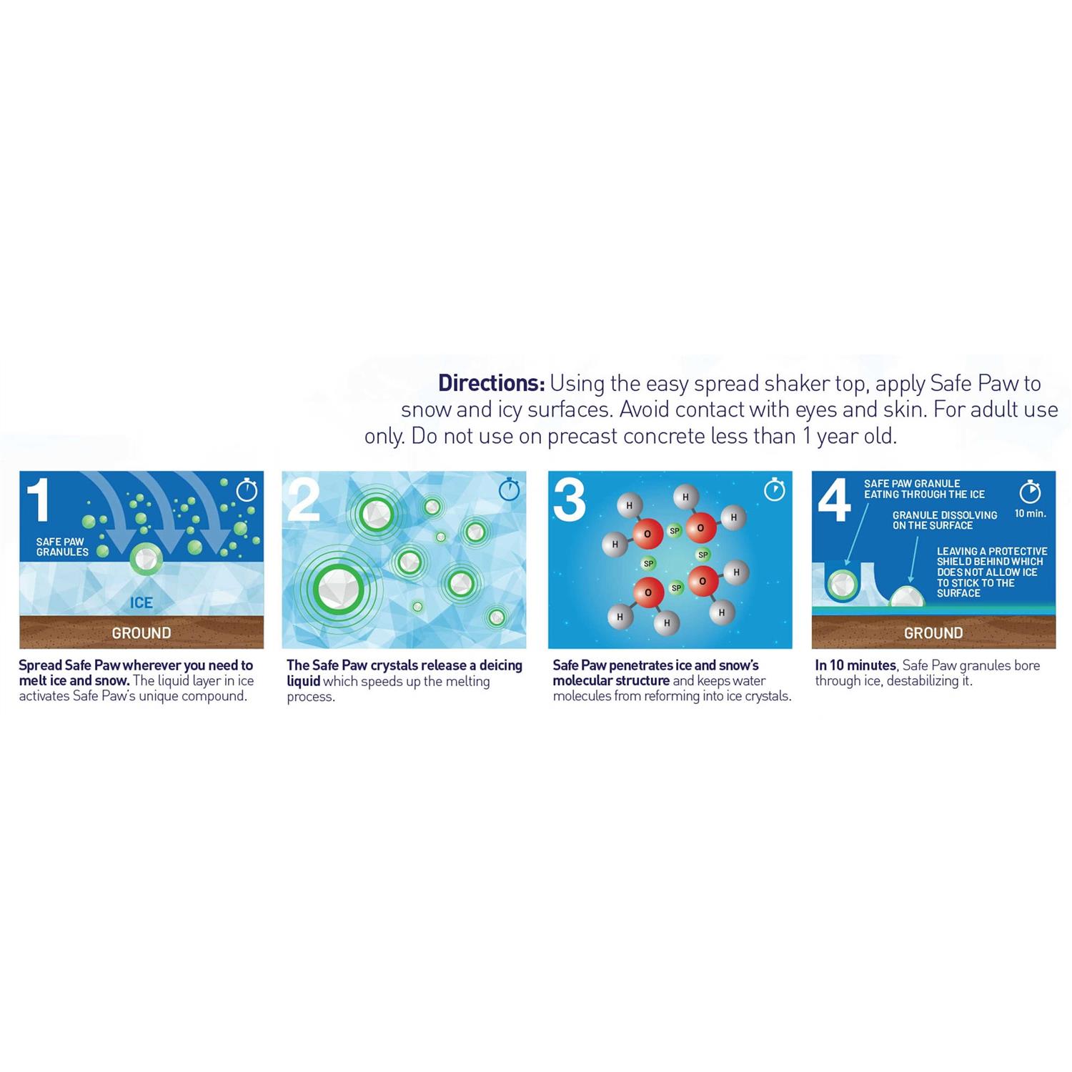 Safe for animals horses dogs cats children lawn and landscape. Used and recommended with confidence for years by veterinarians animal hospitals groomers and boarding kennels. The patented dual-effect compound composition gives Safe Paw a two-way time release action. The liquid component starts melting ice instantly while breaking surface tension. The crystal-core penetrates and destabilizes the ice which speeds up melting. Guaranteed non-corrosive and non-conductive. Safe on concrete asphalt brick and pavers. Features a proprietary traction agent helps prevent slips and falls. Made in USA and packaged by adults with disabilities.