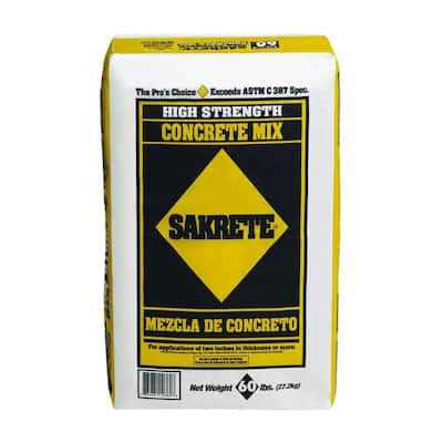 A quality mixture of sand, coarse aggregate and cementitious materials. For repair and building jobs where concrete thickness exceeds 2 inches (50 mm). Ideal for pouring footings, setting posts and poles, and building walkways, driveways, patios and steps. When used as directed, SAKRETE High Strength Concrete Mix meets or exceeds the strength specifications in ASTM C 387. 60 lb. bag. Coverage depends on thickness of application.