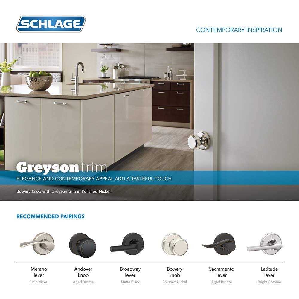 The Schlage Bowery Aged Bronze Passage Door Knob with Greyson Trim is perfect for use on hall and closet doors where locking is not needed. The Bowery Knob’s clean lines and minimalist design give it a futuristic look that is as modern as it is stylish. The Greyson Trim combines elegance with contemporary appeal. The Aged Bronze finish is inspired by traditional design, featuring warm, copper tones that break through its darker, aged exterior. The universal design of this passage door knob set allows it to be mounted to left or right swing doors. Plus, it’s been designed and tested with strength and durability in mind.