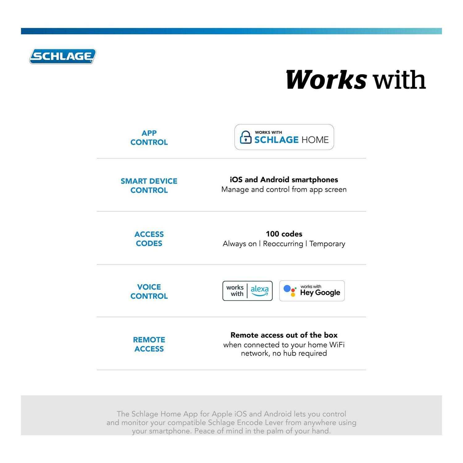 The Schlage Encode Smart Wi-Fi Lever brings easy and secure access to even more doors throughout your home. Seamlessly control and monitor your home from anywhere when connected to your home’s Wi-Fi network and paired with the Schlage Home app, no additional accessories needed. Conveniently schedule up to 100 access codes, view lock history, receive push notifications, pair with Amazon Alexa and Google Assistant for hands-free control and so much more. It is certified highest in Security, Durability and Finish by BHMA industry experts and backed by a century of trusted innovation and security from Schlage. It is ideal for garage and side doors or interior doors like offices or guest suites where secure, convent access control is desired – allowing your home to have smart access control inside and out.