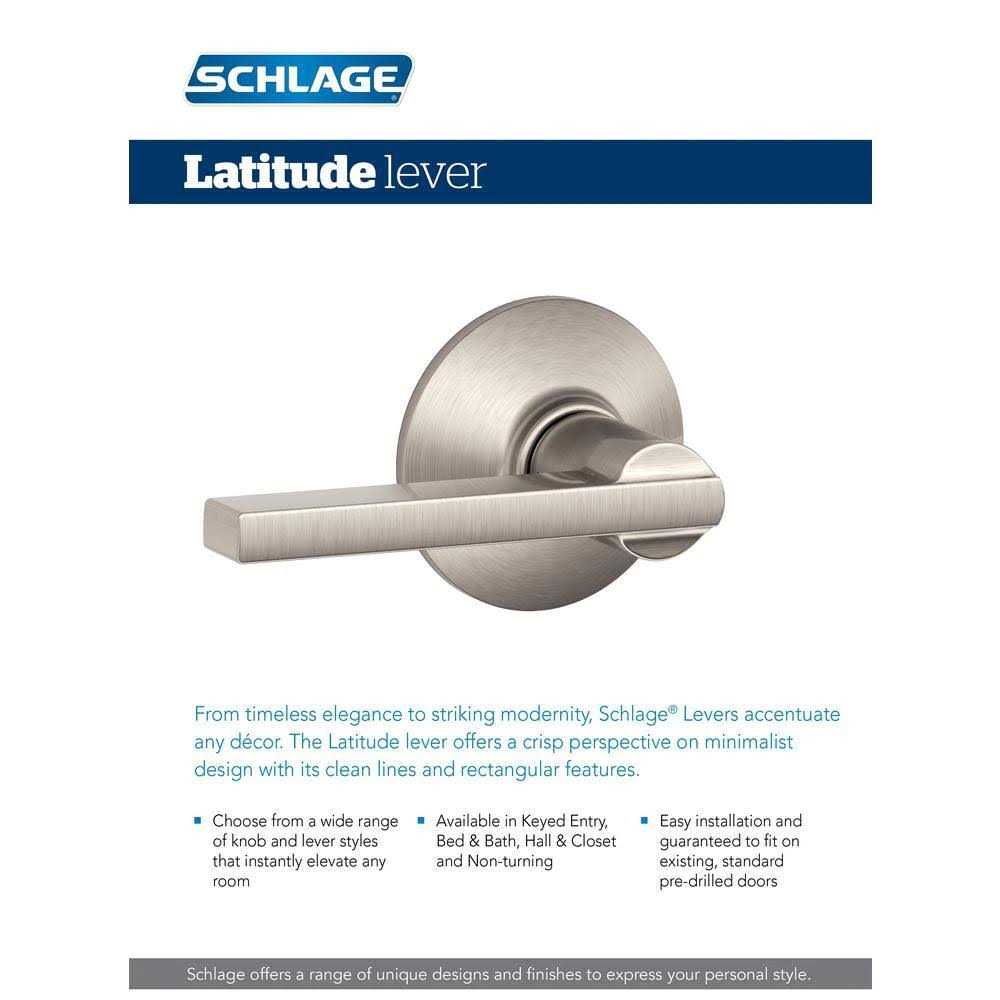 The Schlage Latitude privacy door lever is perfect for interior doors where locking is needed, such as bedroom and bathroom doors. Offers a crisp perspective on minimalist design with its clean lines and rectangular features, and looks especially elegant. Its universal design allows it to be mounted to left or right swing doors. Plus, its been designed and tested with strength and durability in mind.