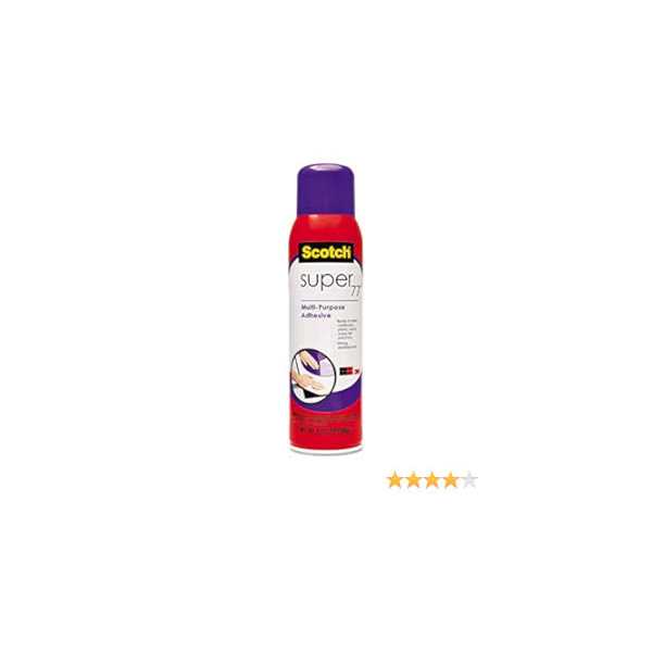 Scotch Super 77 Multi-Purpose Adhesive is an extremely versatile, fast-drying spray adhesive that bonds a wide range of lightweight materials. Its fast, aggressive tack and low soak-in make it ideal for a broad range of projects. Use it for bonding paper, cardboard, fabric, cushion foam, plastic, metal, wood, and much more. Adhesive Type: Aerosol/Spray; Packing Type: Can; Washable: No; Color on Application: Clear.
