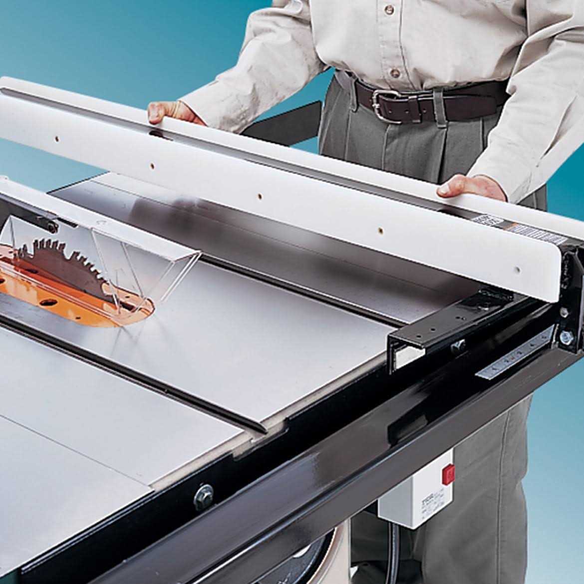 This 42″ long fence has easily replaceable side panels made of HDPE plastic, a tough abrasion resistant material that is smoother than Teflon. The fence body is heavy walled rectangular tubing for durability. A high visibility scale allows easy, precise and repeatable settings and the fine lined cursor can be mounted on either side of the fence body, depending on your preference. The fence locks positively into position with a cam-action lever, making one-handed fence adjustment a snap. The fence system comes with super heavy-duty front and rear rails which can be mounted on almost any size or brand of table or cabinet saw (some modification to your table saw or its parts may be needed to get it to fit); it is designed for 27″ deep tables. Fence rails are epoxy painted for a long lasting finish. The fence can be lifted off the rails anywhere along its length for the ultimate in convenience. An optional extension table measuring 44″ X 27″ is also available to provide a large worktable surface. The extension table includes a leg kit which provides two 32″ high adjustable legs to provide stable support for the saw and table assembly. The extension table is made entirely of hardwood plywood with a durable laminated surface.
