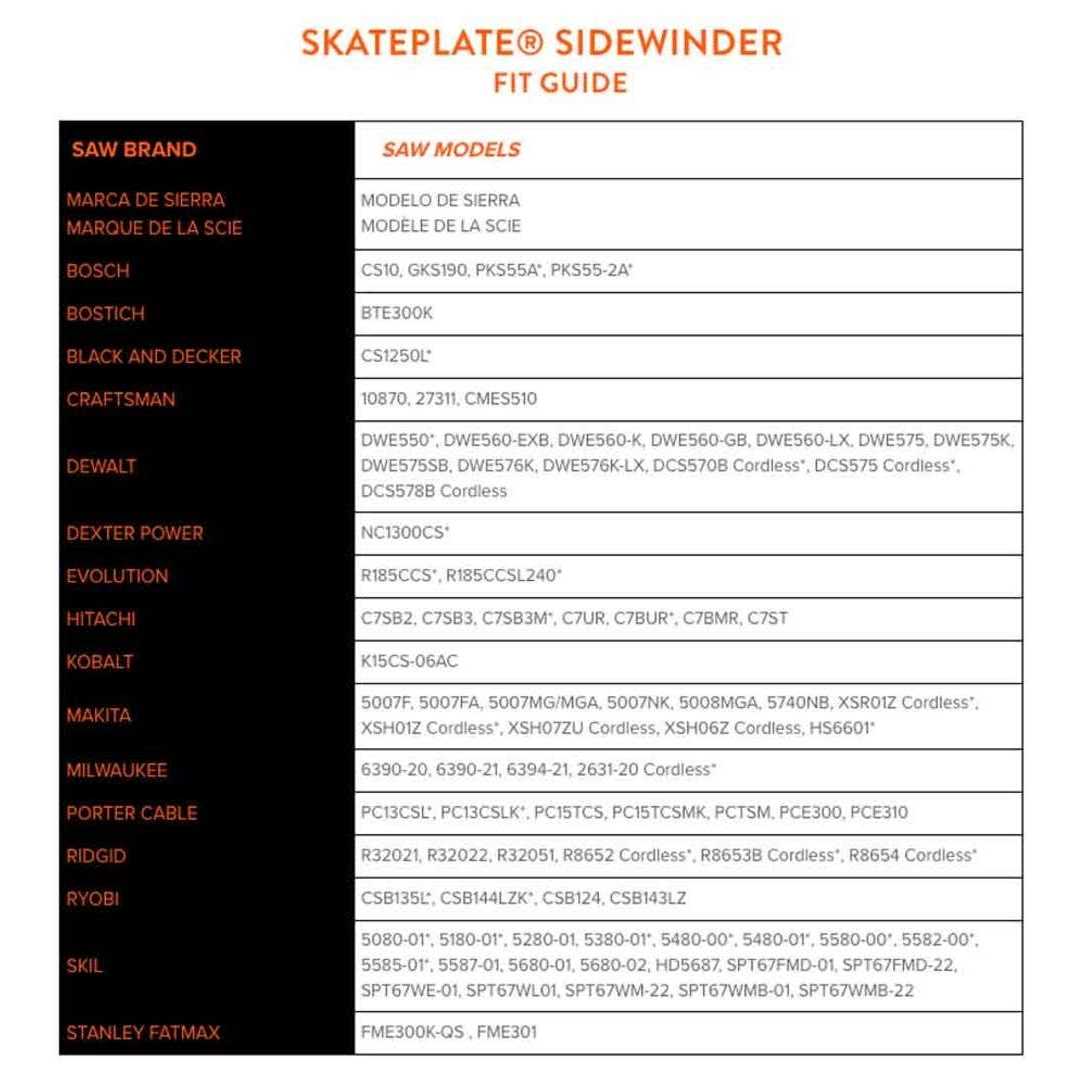 Optimize the safetywhen using your Circular Saw with SkatePlate Sidewinder (Right Blade) from Circsaw Technologies. SkatePlate is a removable, rolling assembly that is used by professionals and DIY enthusiasts that transforms a circular saw into a portable table saw, saving time and money. With an adjustable rolling rip fence, you measure once and can make multiple identical cuts with no need for chalk lines. Excellent for rip cuts, notch cuts, angle cuts and custom cuts, the unit will glide with ease across the surface which will improve accuracy on precision cuts. The SkatePlatereduces saw kickbacks and scratches on the work piece, unit will assemble and set up in minutes. The body is glass-filled, high impact nylon body with polyurethane rollers and Delrin bearings for long lasting durability. The combo kit includes the SkateGuide for a complete setup. SkatePlate fits over 95% of the most popular 7-1/4″ circular saws.